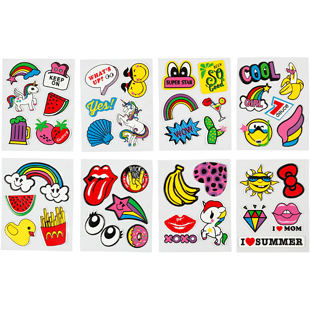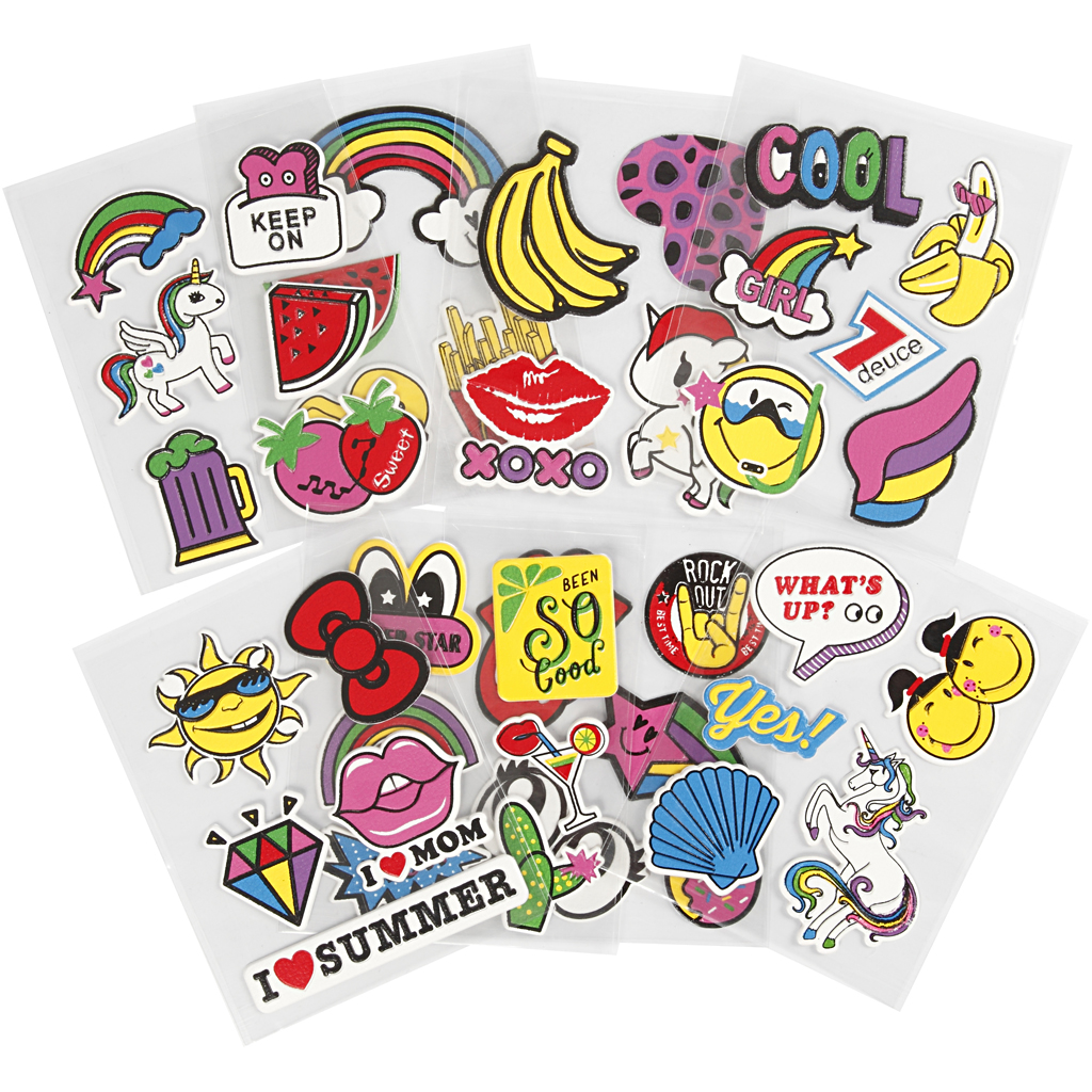 Self-adhesive stickers made of plastic, printed with colourful motifs. Used for decoration on bags, mobile covers and shoes. Pack with 8 different sheets each with 4-6 motifs. Soft Stickers, 12,2x17,75 cm, 8 sheet/ 1 pack