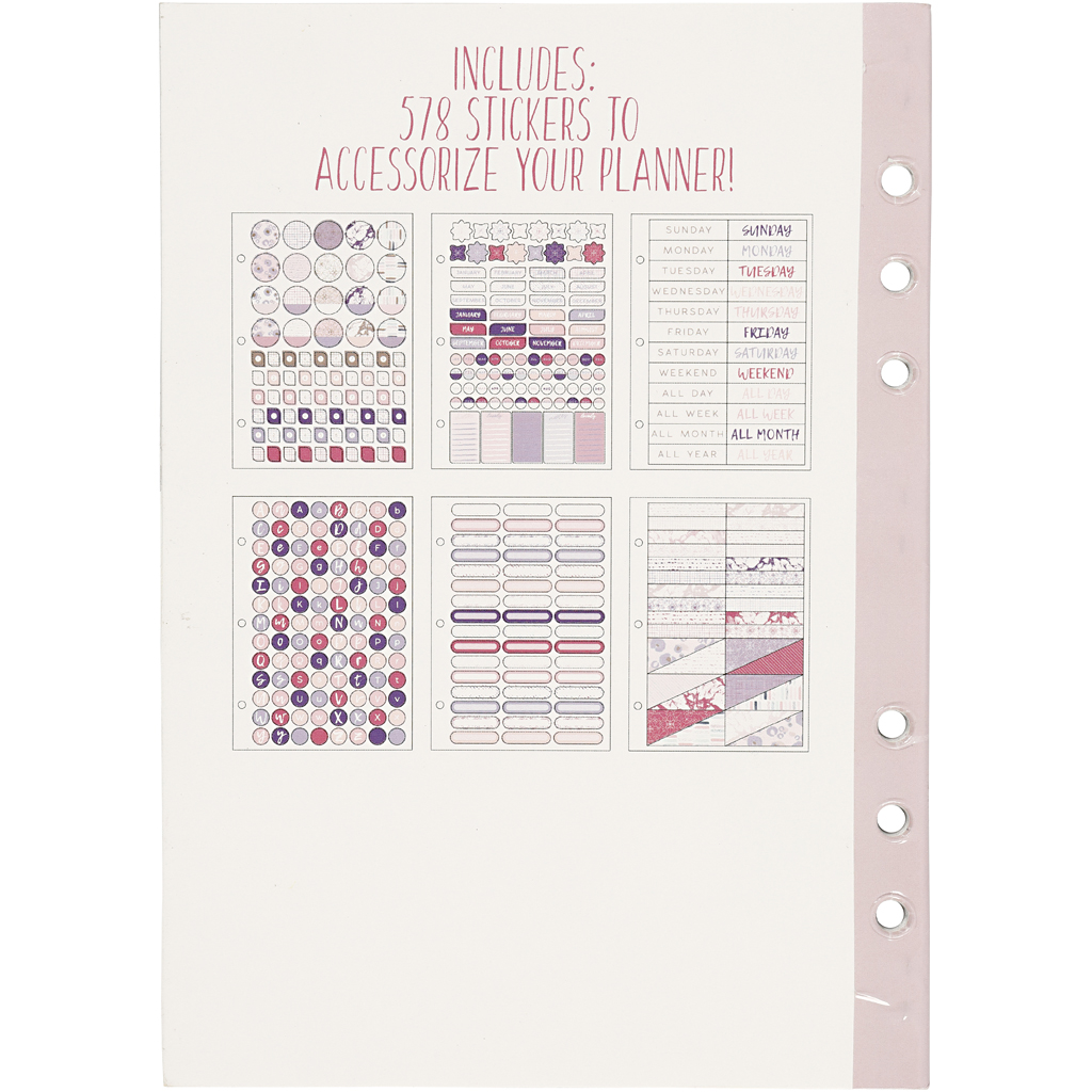 Assortment with a wide selection of stickers with weekdays, months, numbers, letters etc. in beautiful, tuned shades for travelling- and creative journal. Incl. clear plastic front and 6 holes. Fits calendar covers 192648-192651. Contents: 8 sheets w. Sticker book, gold, purple, rose, flowers, A5, 1 pc