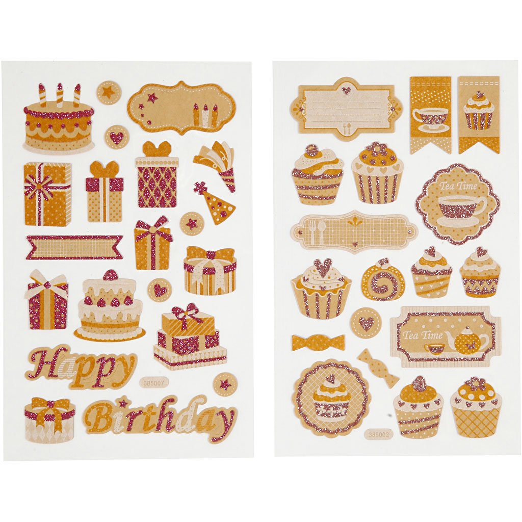 Self-adhesive motifs of matte paper. All the details in glitter. 4 sheetes (2 pcs. of each design). Stickers, birthday and cup cakes, 10x16 cm, 4 sheet/ 1 pack