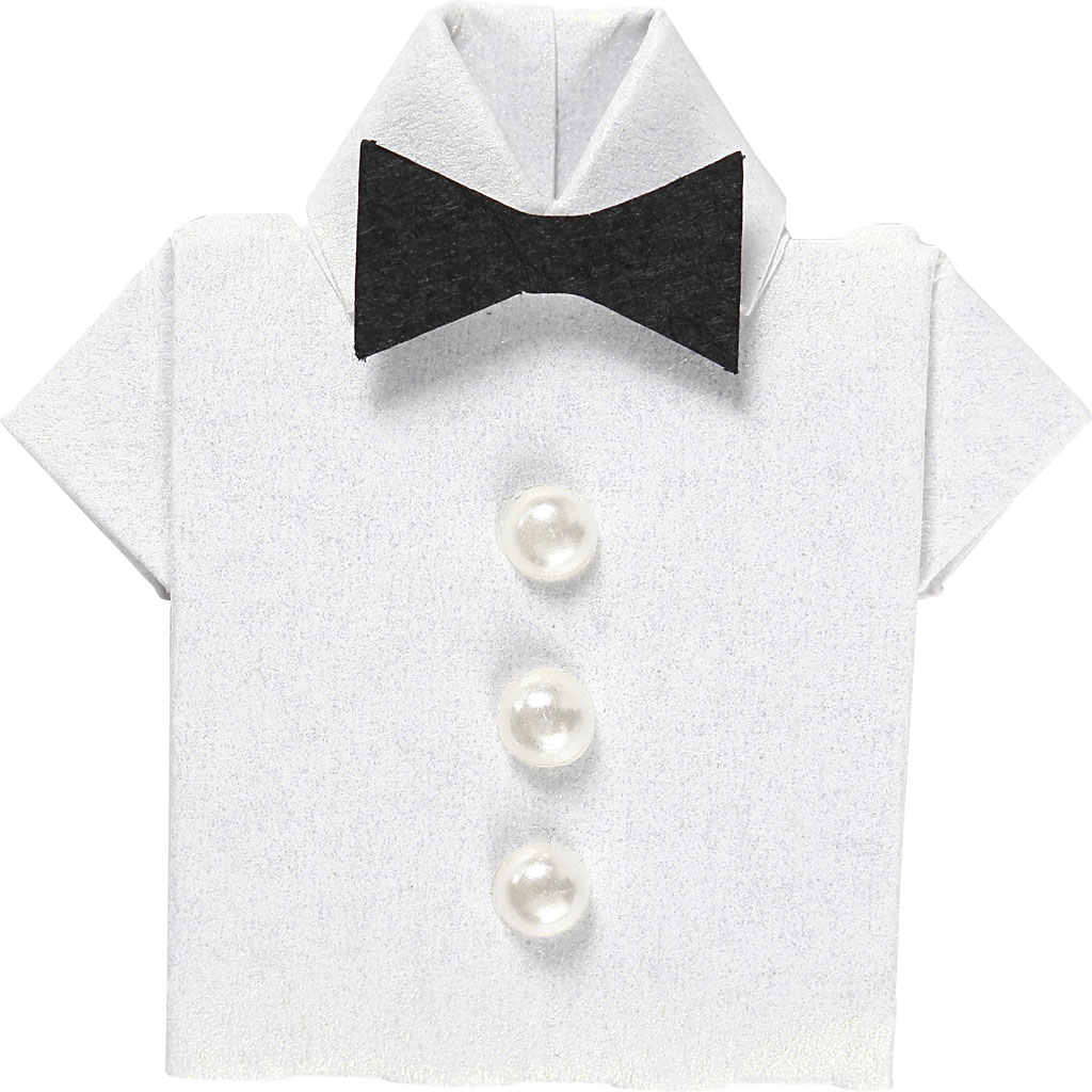Stickers in the shape of a shirt with adhesive pad on the back for a 3D effect. The shirt is folded in origami with extra fine detail of white paper, has a black bow tie and little gems-like buttons. Stickers, white, shirt, size 33x35 mm, 6 pc/ 1 pack