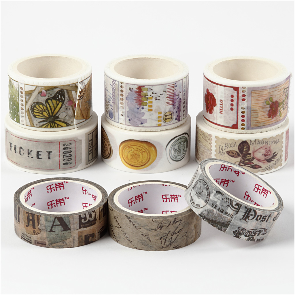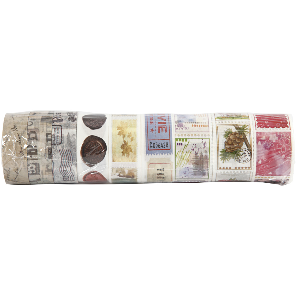 Washi tape of fine, matte paper with printed patterns. Washi Tape, L: 3+5 m, W: 15+25 mm, 9 roll/ 1 pack