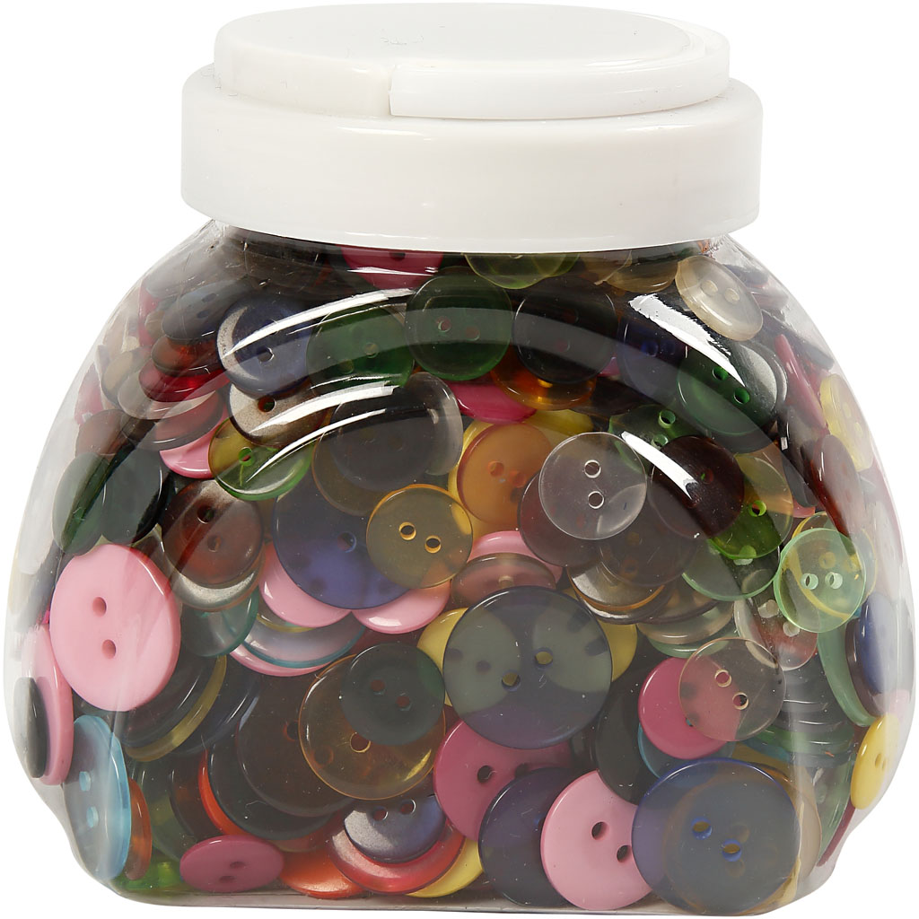 Mix of 2-hole flat round plastic buttons in a variety of opaque and transparent colours. Button Mix, assorted colours, dia. 12+18+20 mm, 800 pc/ 1 pack