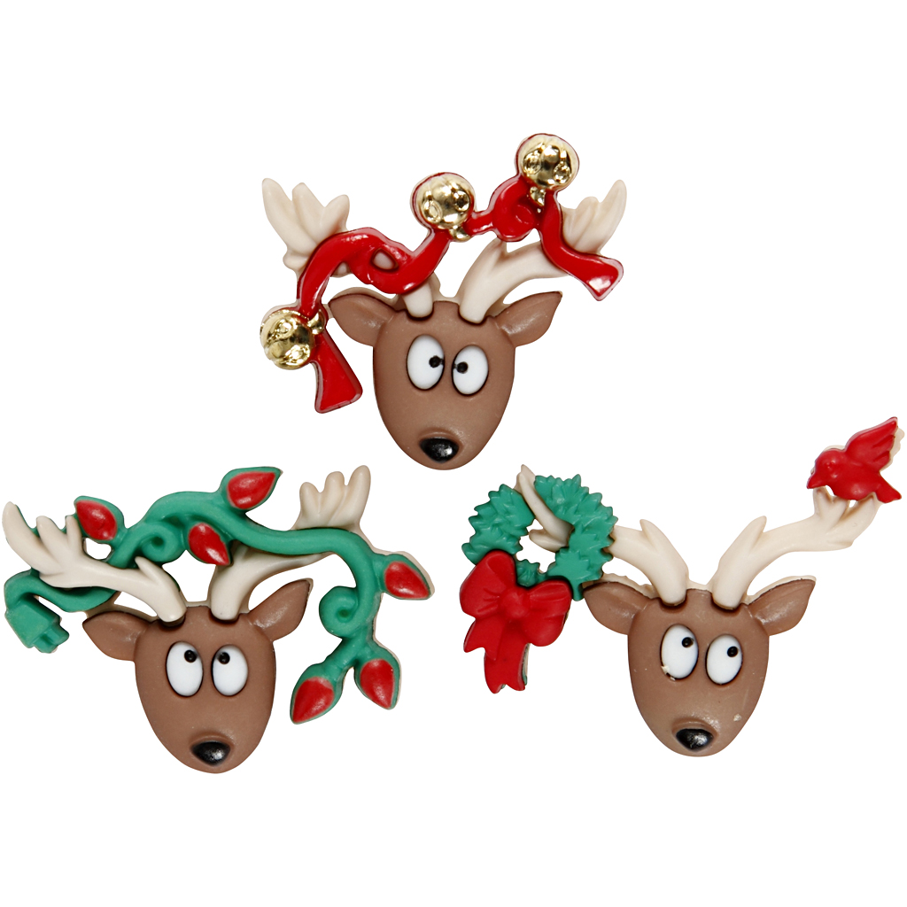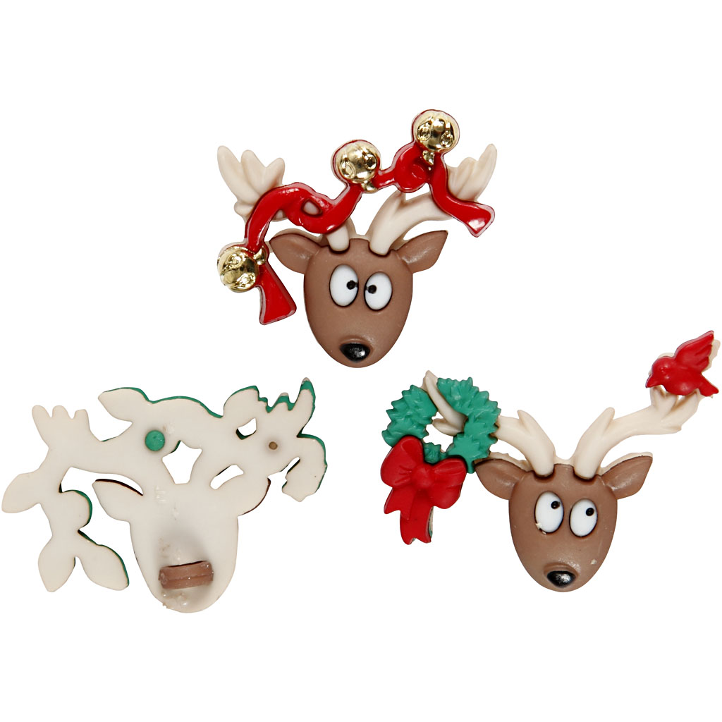 Novelty-shaped plastic buttons. 3 x reindeer-shaped buttons. Novelty Buttons, oh deer, H: 23-25 mm, W: 28-34 mm, 3 pc/ 1 pack