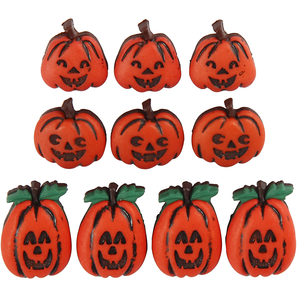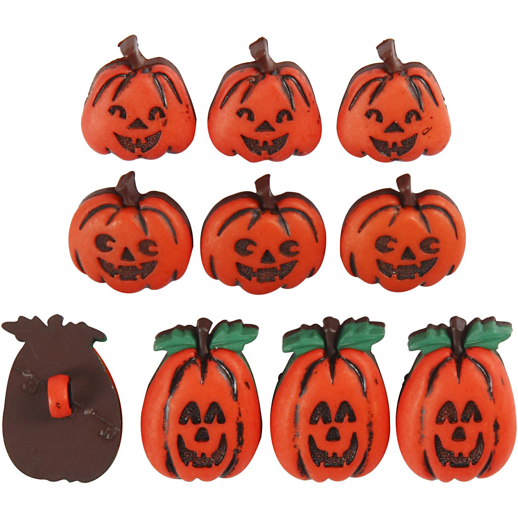 Novelty-shaped plastic buttons. 10 x pumpkin-shaped novelty buttons. Novelty Buttons, jack o'lanterns, H: 14-20 mm, W: 13-14 mm, 10 pc/ 1 pack