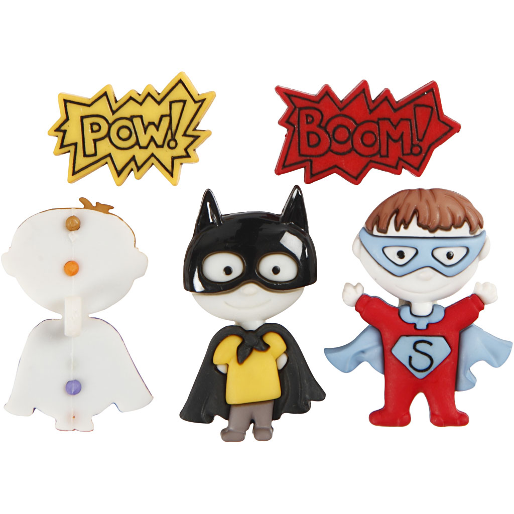 Novelty-shaped plastic buttons. 5 x super hero novelty-shaped plastic buttons. Novelty Buttons, by my superhero, H: 14-32 mm, W: 18-21 mm, 5 pc/ 1 pack