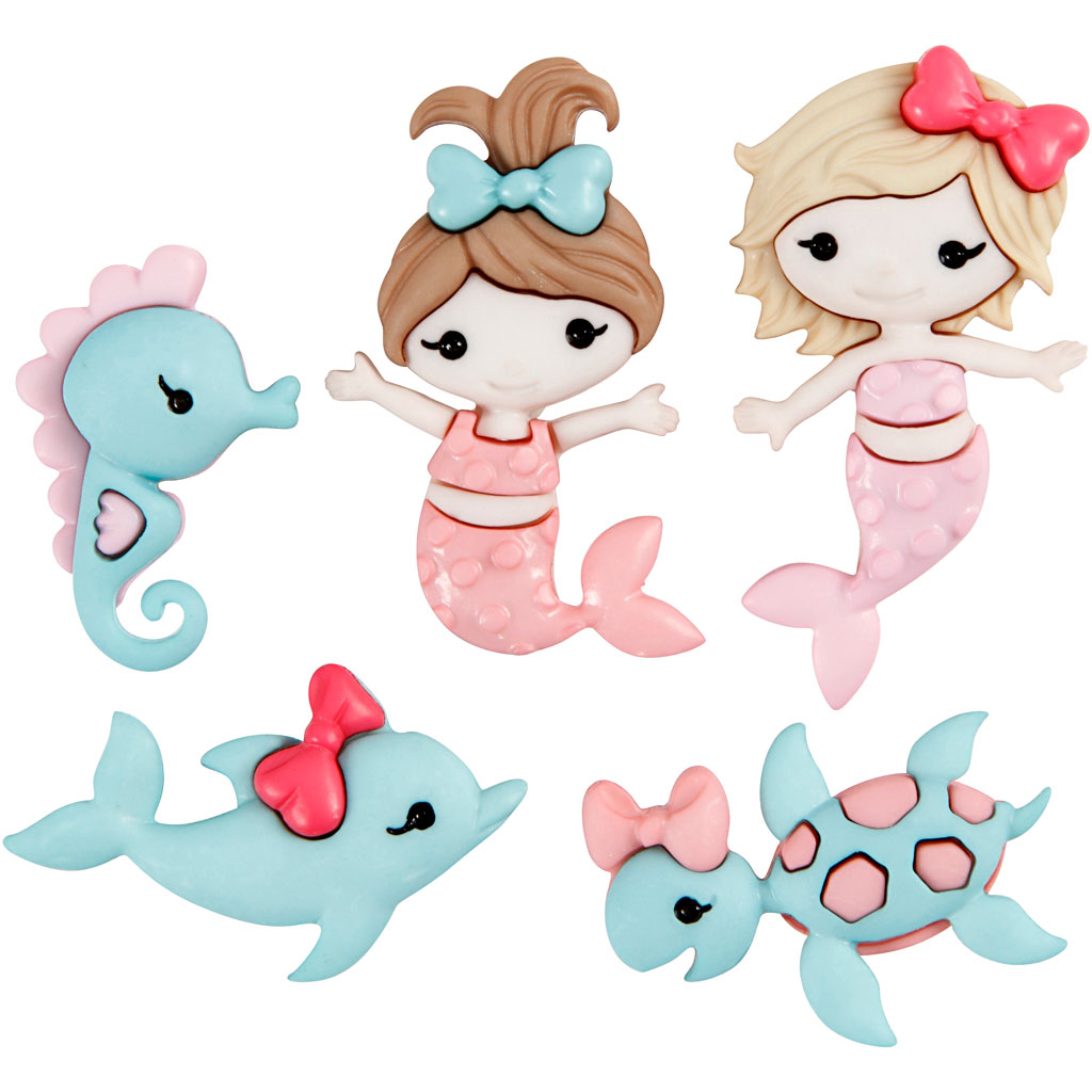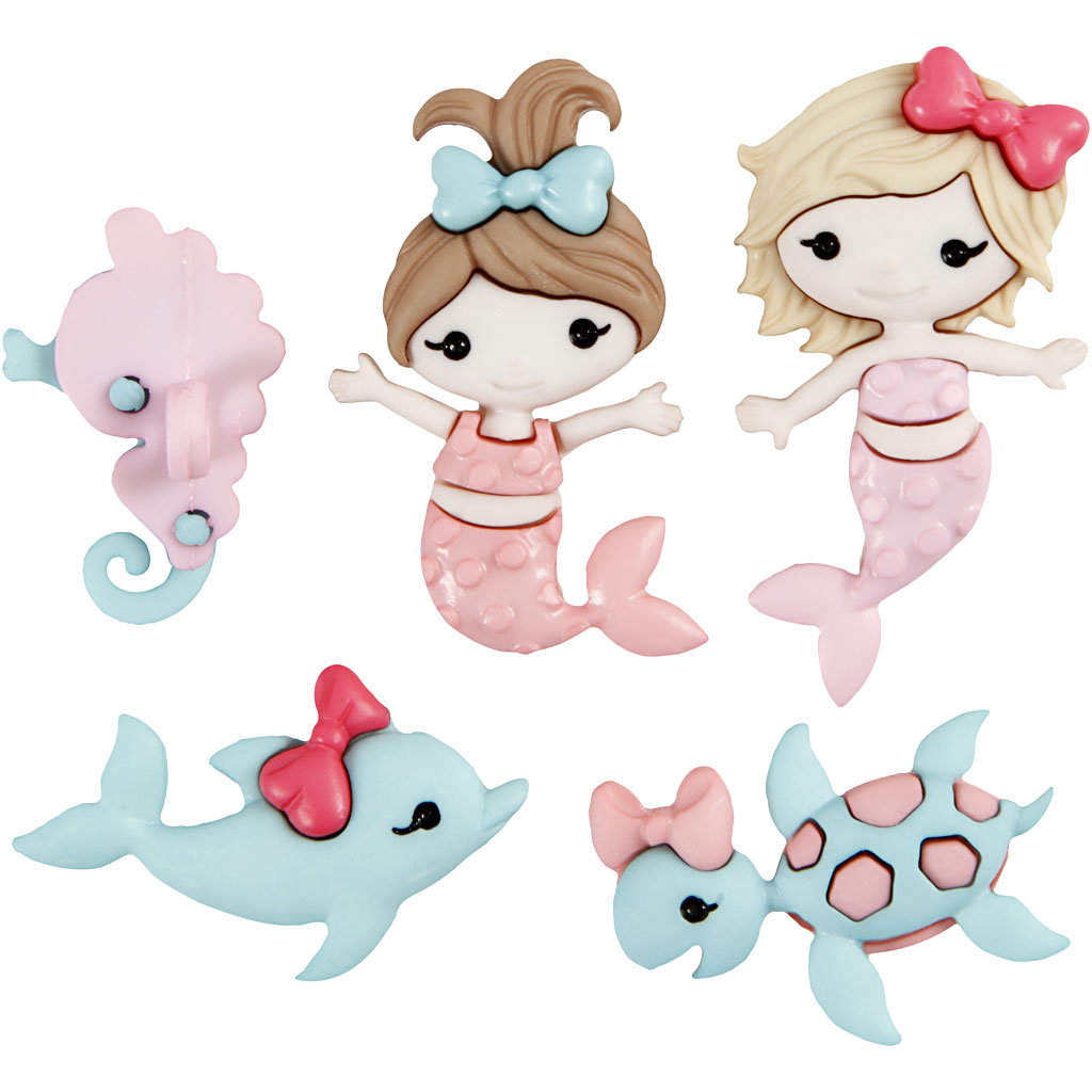 Novelty-shaped plastic buttons. 5 sea-themed novelty-shaped plastic buttons. Novelty Buttons, mermaid kisses, H: 22-35 mm, W: 19-21 mm, 5 pc/ 1 pack