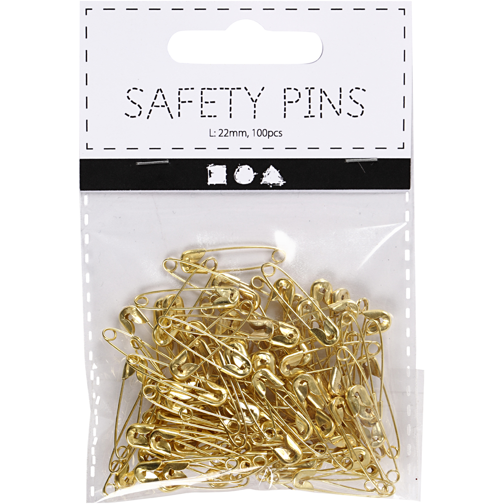 Safety pins made of metal. Safety Pins, gold, L: 22 mm, thickness 0,6 mm, 100 pc/ 1 pack