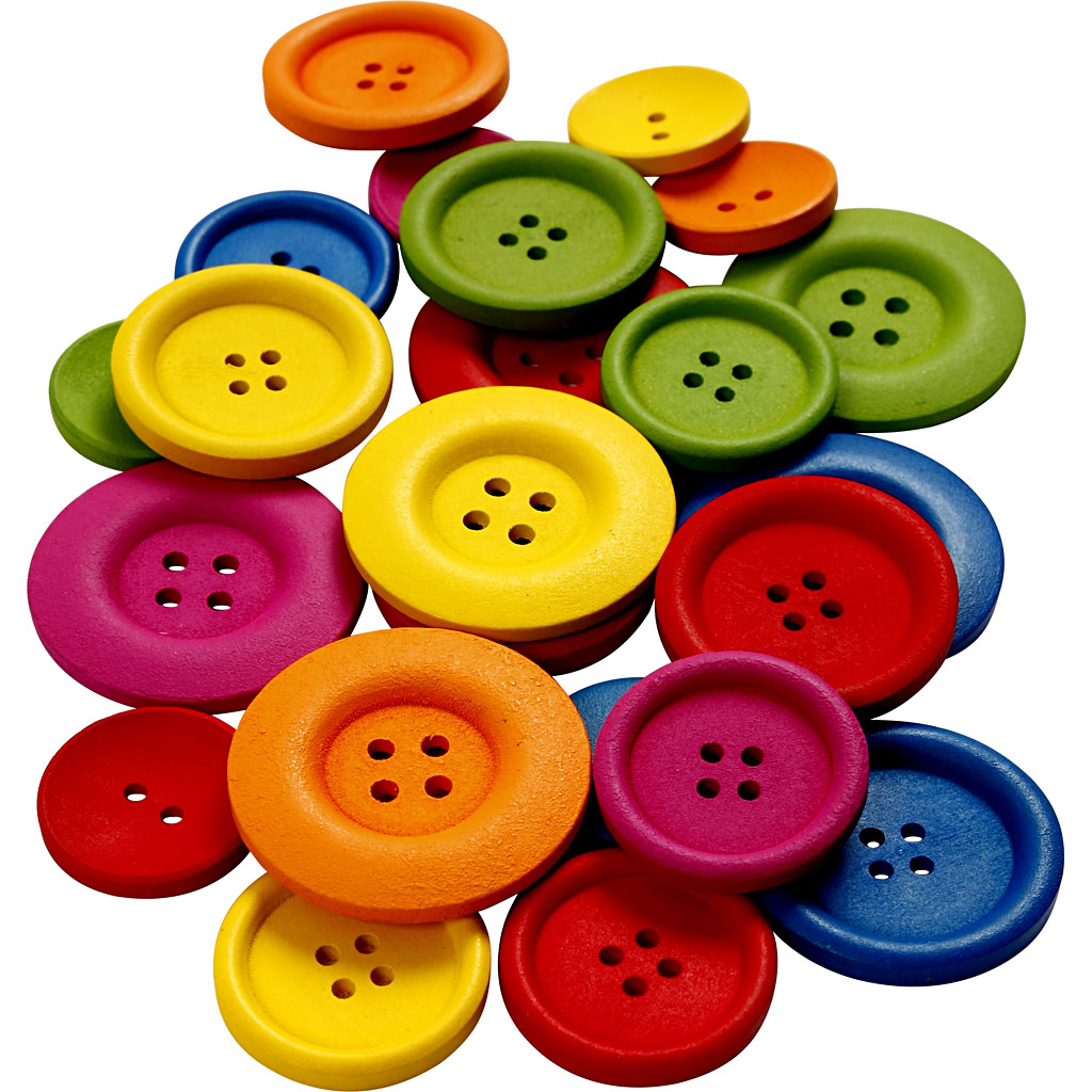Wooden buttons in bright colours with glossy surface. Wooden Buttons, assorted colours, dia. 25-40 mm, 2-4 holes, 144 pc/ 1 pack