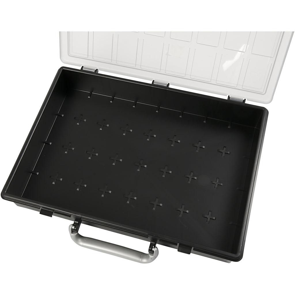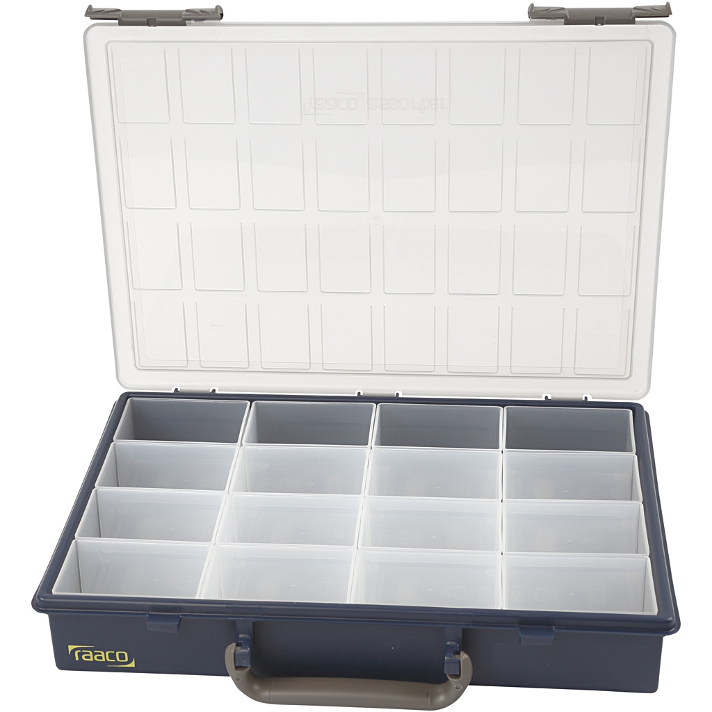 Raaco storabe box made of polypropylene (PP) fitted with sliding lock and handle. Can be sub-divided with insert boxes. Storage Box, size 33,8x26,1 cm, H: 5,7 cm, 1 pc