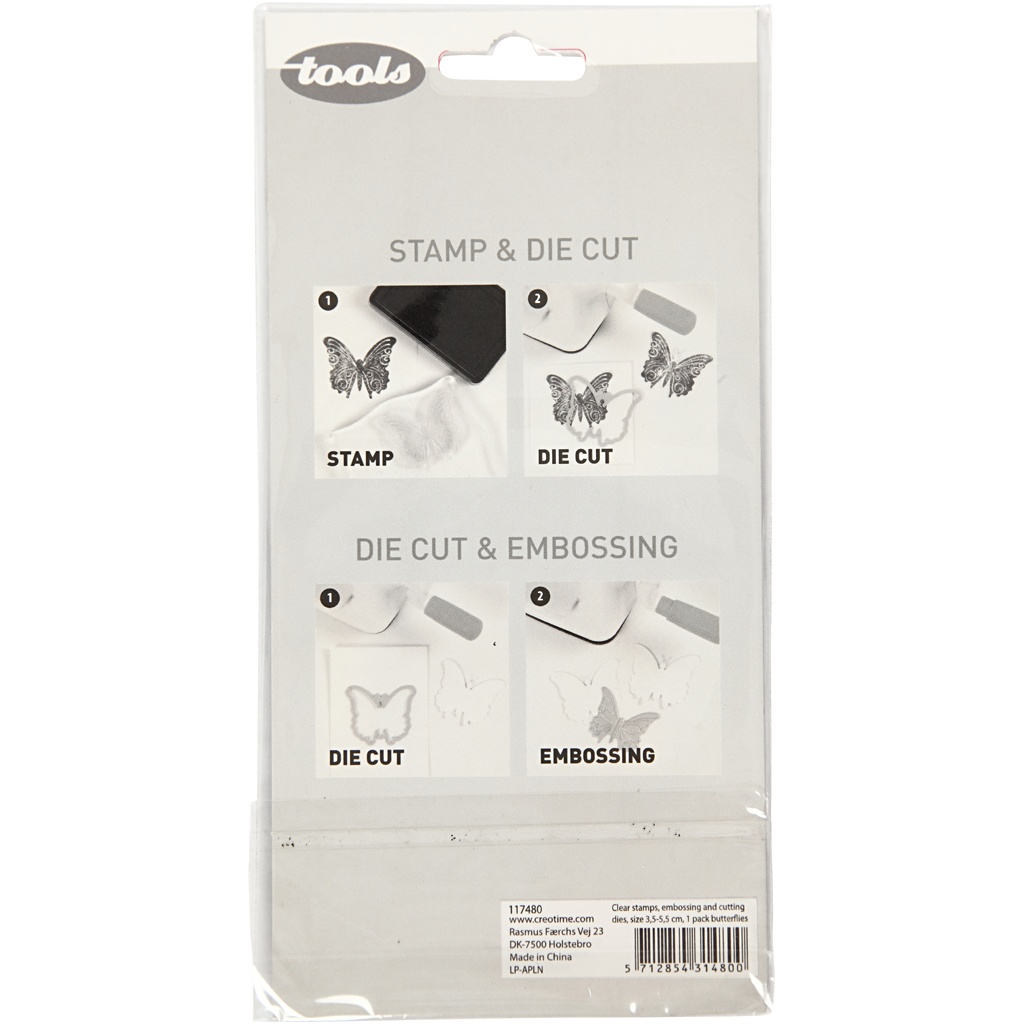 Set of clear silicone stamps, which can be combined with the supplied die cut and embossing templates. For punching in cardboard, paper, card and the like. Used in Die Cut and Embossing Machine - Item no. 11761, 11792 and 11799. Contents: 5 stamps, 1 embossing template and 3 die cuts. Clear stamps, embossing and cutting dies, butterflies, size 3,5-5,5 cm, 1 pack