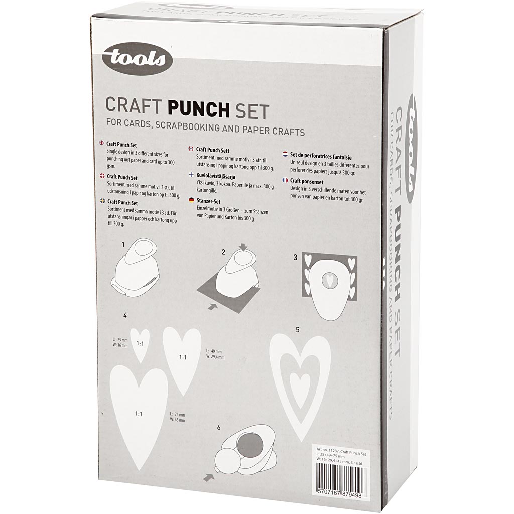 The set contains paper punches in different sizes ideal for combining. Punches paper and thin card (maximum 240 g). Pack with 3 different sizes - punches paper and thin card (maximum 240 g). Craft Punch Set, heart, size 25+49+75 mm, 3 pc/ 1 pack