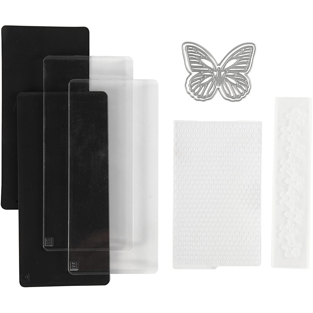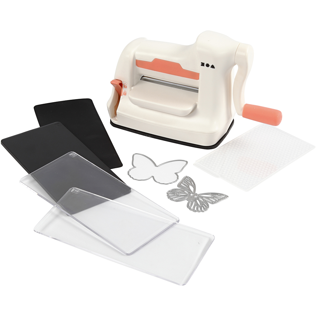 Start Kit with user-friendly tool for both cutting and embossing all materials like paper, cardboard, EVA foam, plastic etc. Can be mounted with templates from other manufacturers similar purposed tools. Contents: 1 Die Cut and Embossing machine with heavy duty worktop, 2 acrylic cutting sheets, 1 cutting plate, 1 silicone plate, 2 embossing templates and 1 template. Starter kit - Die Cut and Embossing Machine, A7, 74x105 mm, 1 set