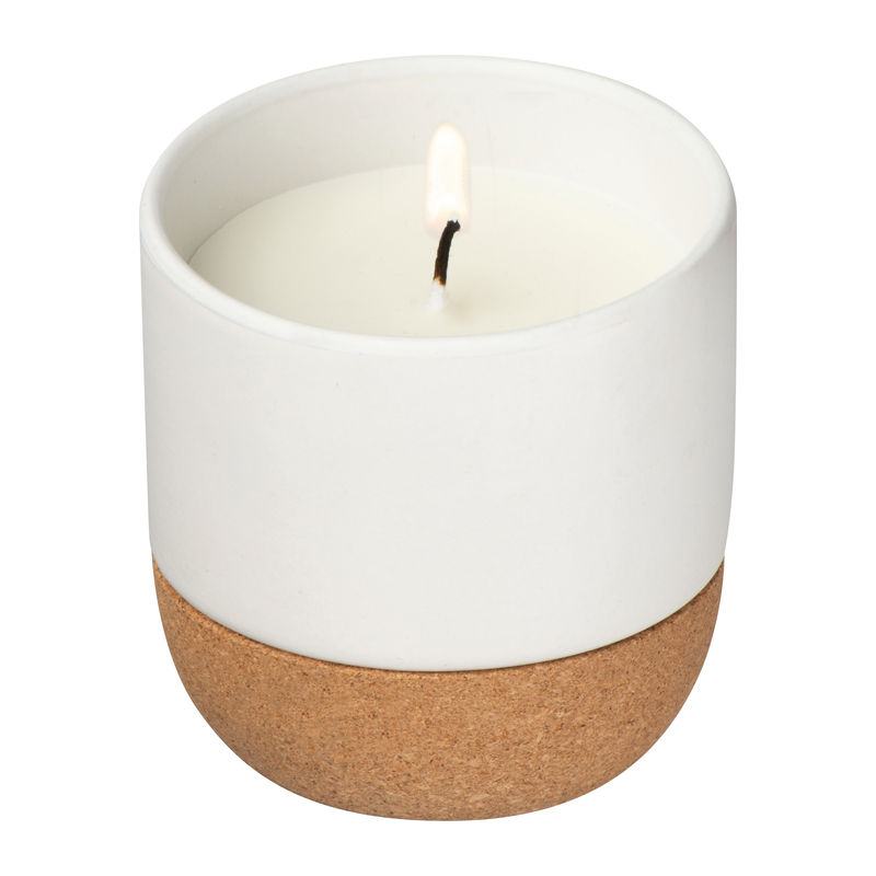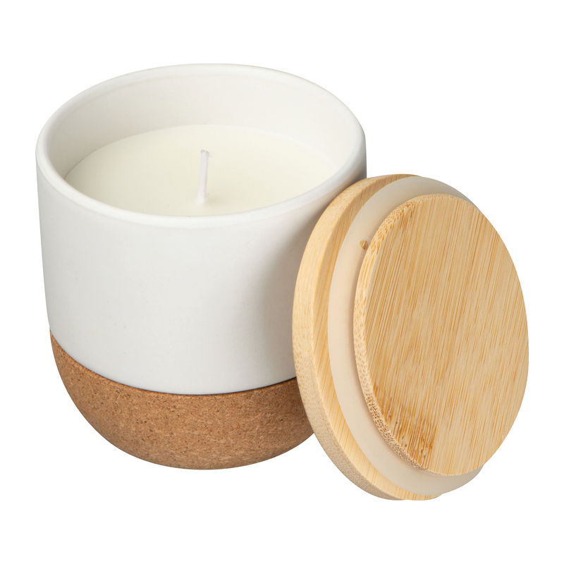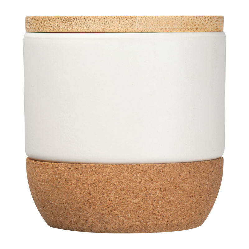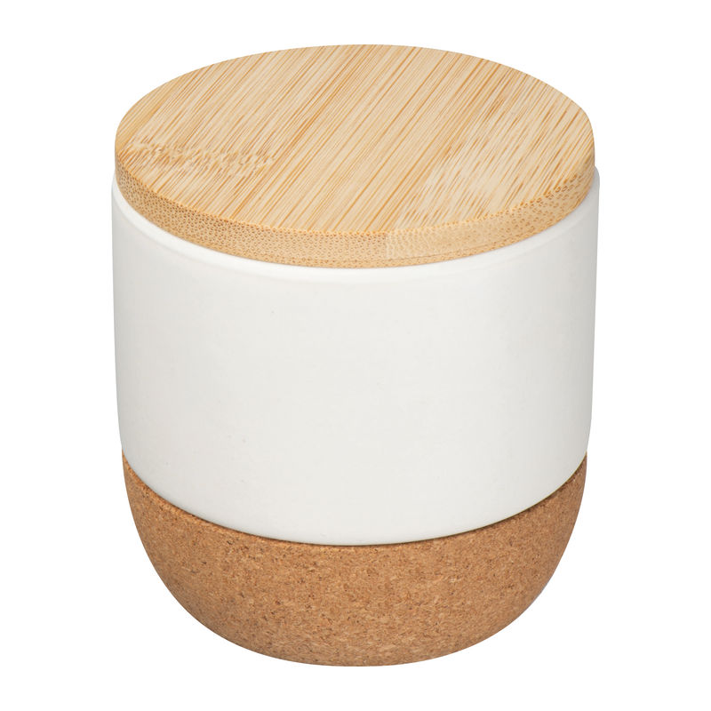 A candle presented in a ceramic jar featuring a cork base and bamboo lid. Elegant and ideal for creating a cosy atmosphere. Each unit and engraving is unique due to the natural bamboo material.