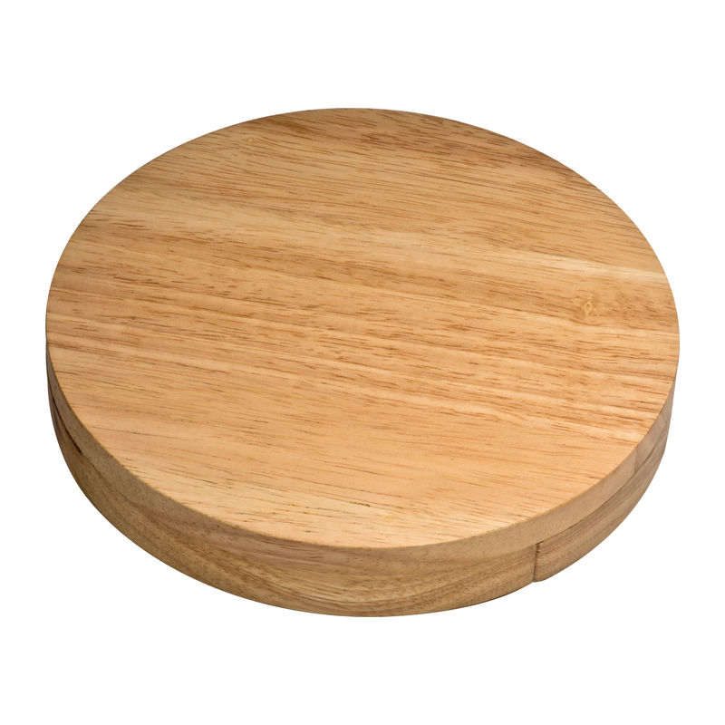 Cheese cutting board crafted from rubberwood, including a cheese knife, cheese fork, and waiter's knife. Each unit and engraving is unique due to the natural material.