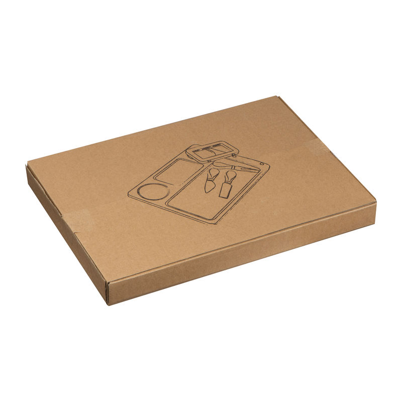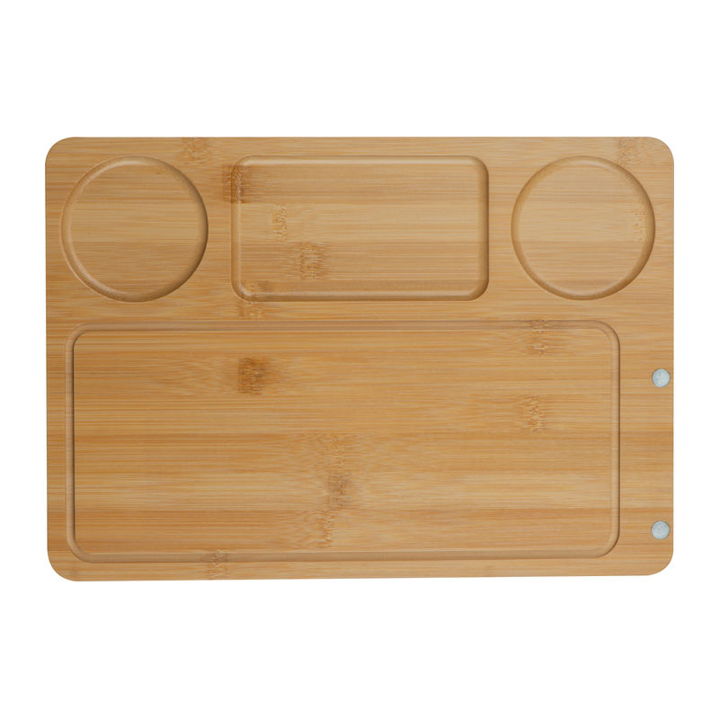 Cheese board set consisting of a large serving plate made of bamboo with magnetic holder for stainless steel cheese cutlery. Your logo will be engraved on the plate.