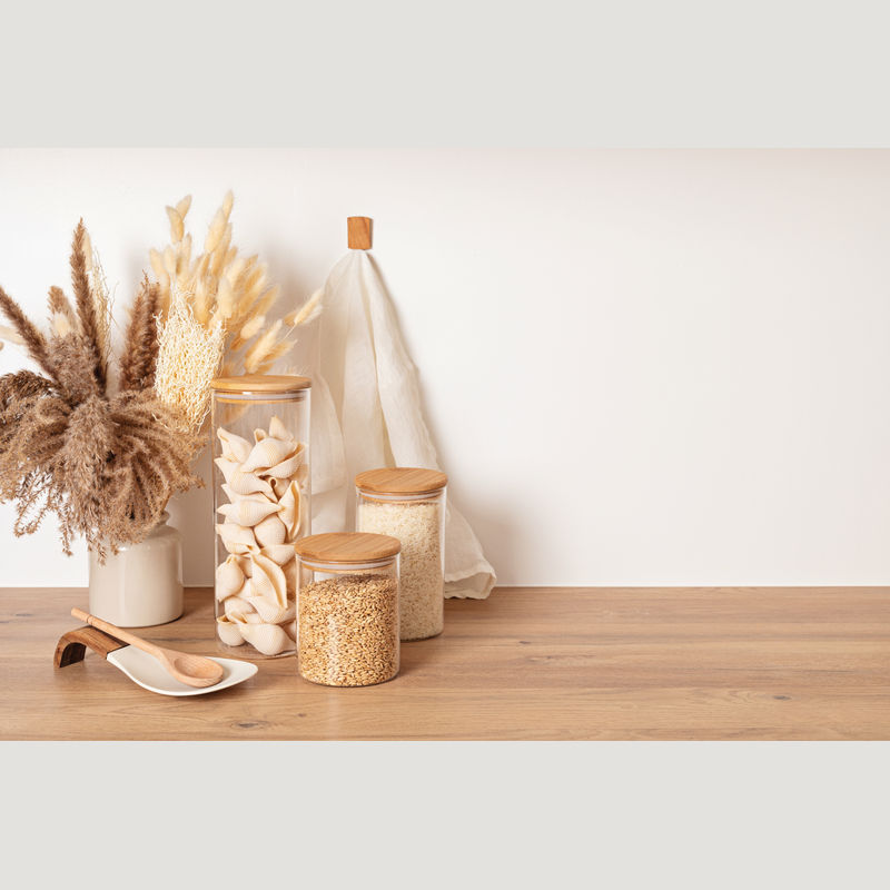 Storage jar made of borosilicate glass with a wooden lid and silicone ring. With a capacity of 1000ml, this storage jar should not be missing in any kitchen. We laser your logo onto the wooden lid.