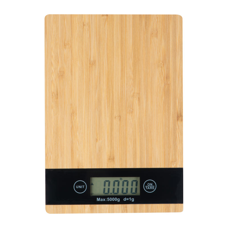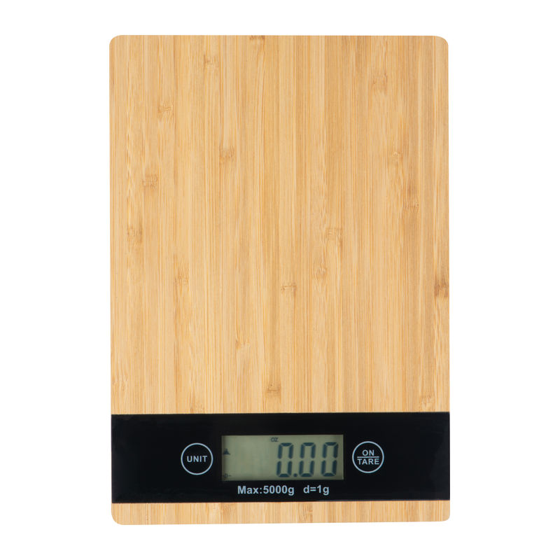 Digital bamboo kitchen scale featuring a black-framed display. It supports a maximum capacity of 5 kg and provides measurements in kg, g, or oz with an accuracy of 1 g. Each item and engraving is unique due to the natural bamboo material.