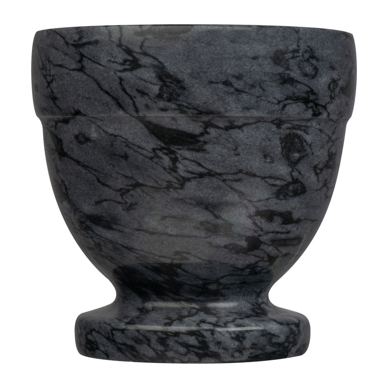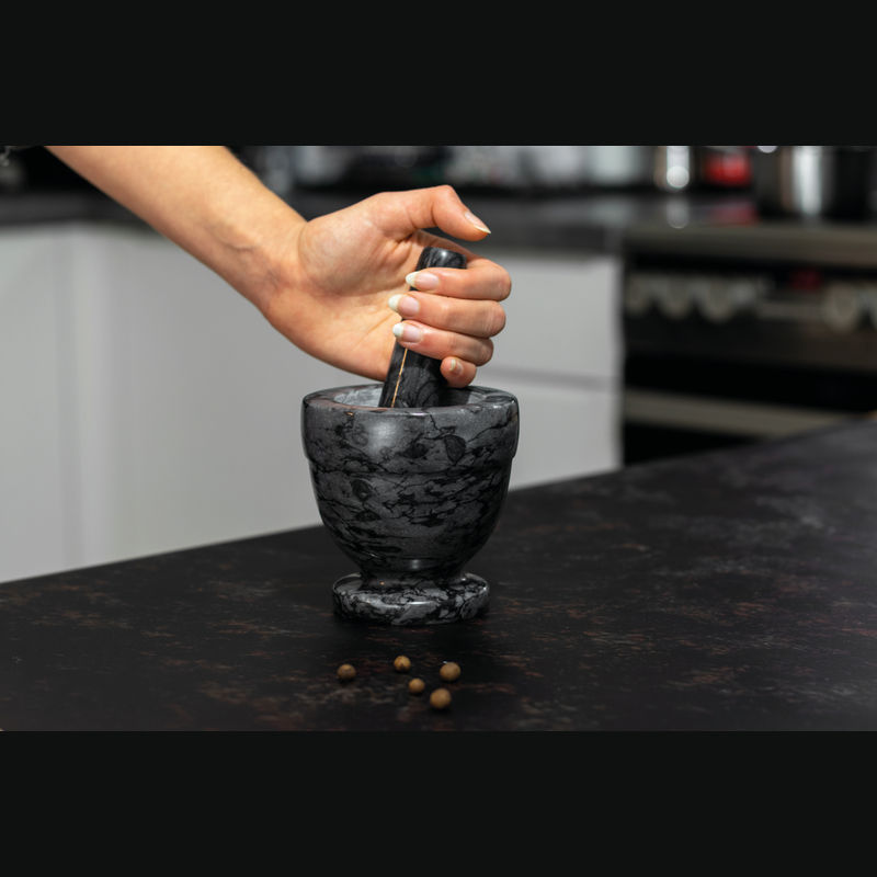 Marble stone mortar with matching pestle. The comfortable weight avoids annoying slipping and conveys quality. Your logo will be placed on the pestle.