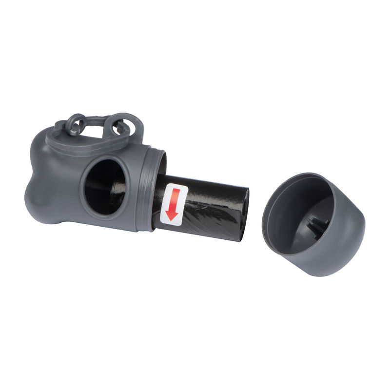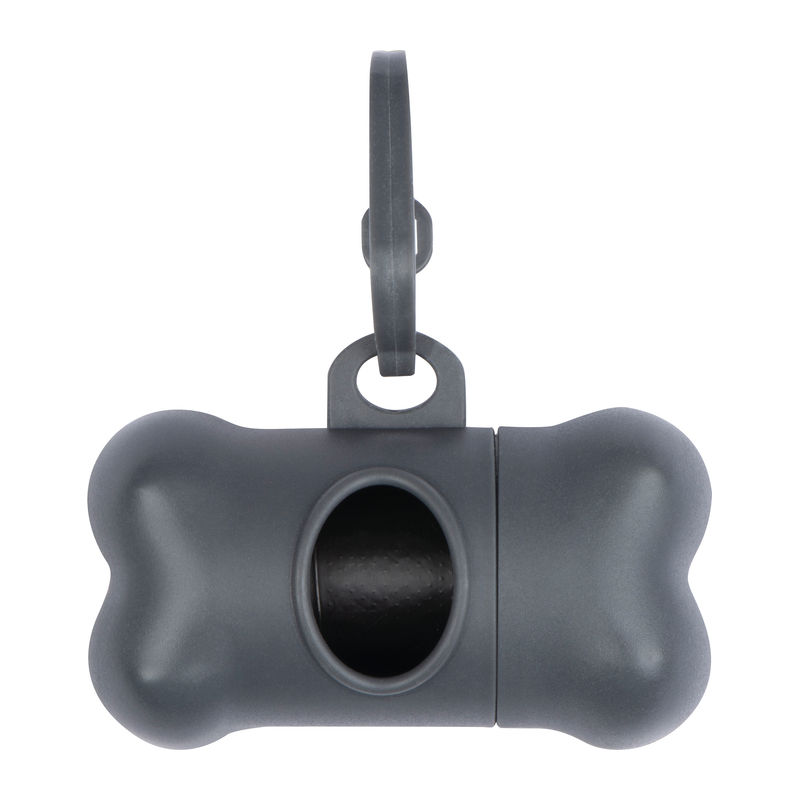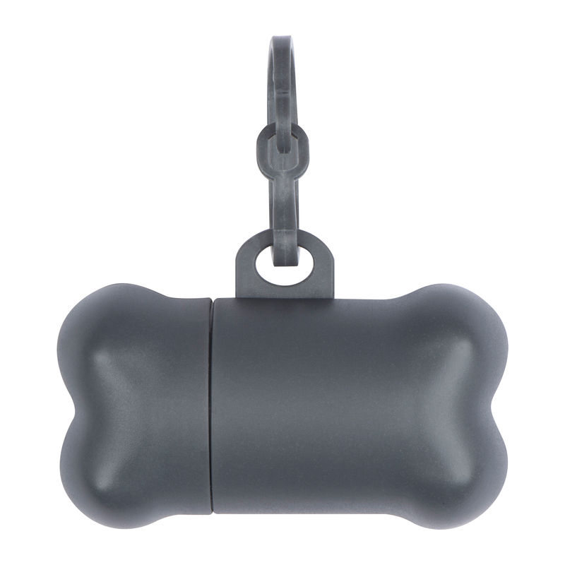 Screw-on dog waste bag dispenser shaped like a bone, featuring a plastic carabiner and supplied with 15 biodegradable bags.