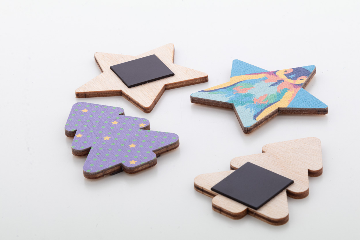 Custom made, birch plywood Christmas fridge magnet with full colour printing. Price includes UV LED printing. MOQ: 200 pcs.