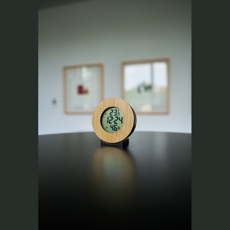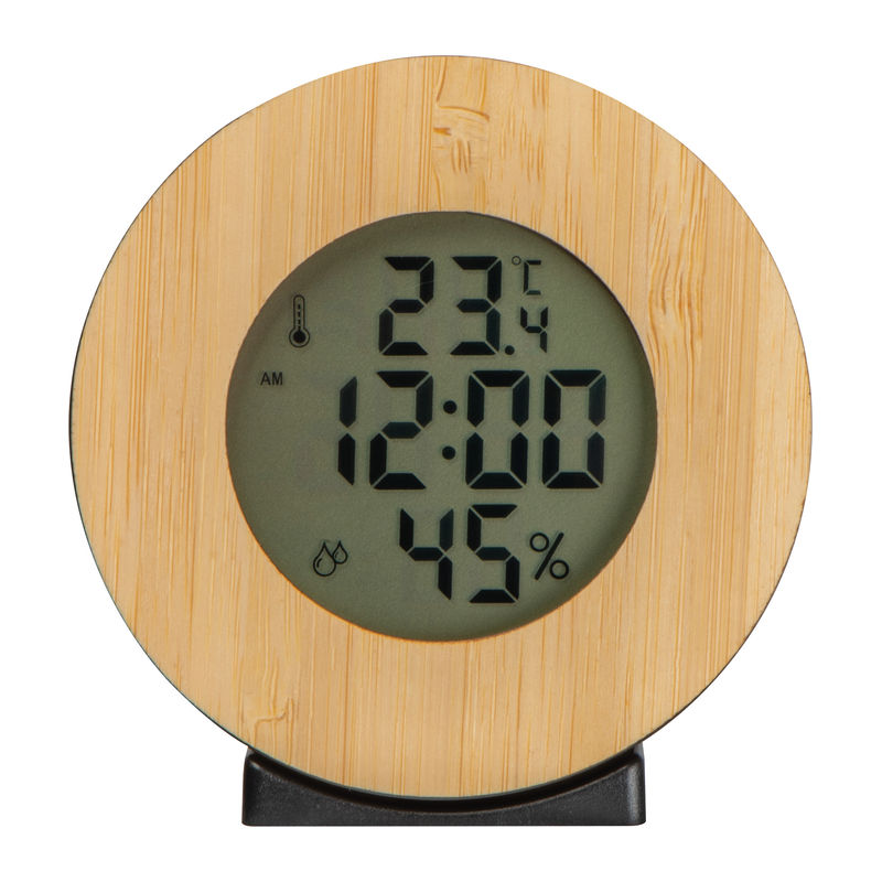 Digital weather station with clock, crafted from bamboo. Stylish and functional, it displays time and weather information, making it ideal for a modern, environmentally conscious home.