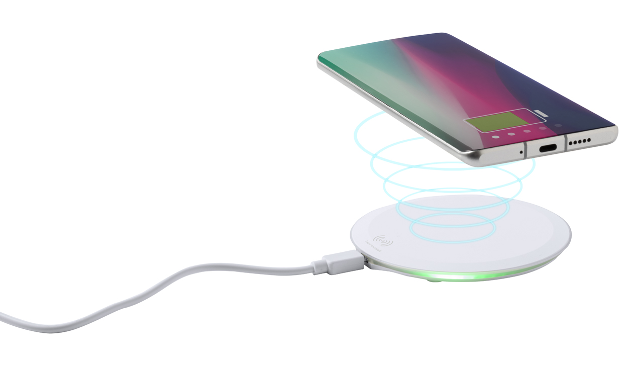 Wireless fast charger (10W) in plastic housing with LED charging indicator light and non-slip base. Including USB charger cable.