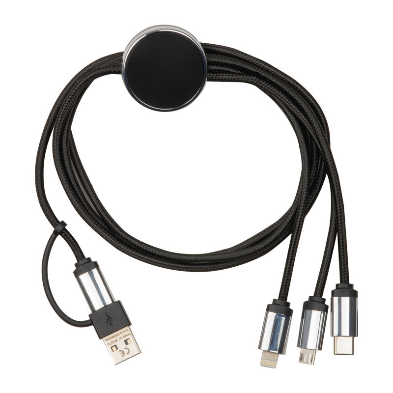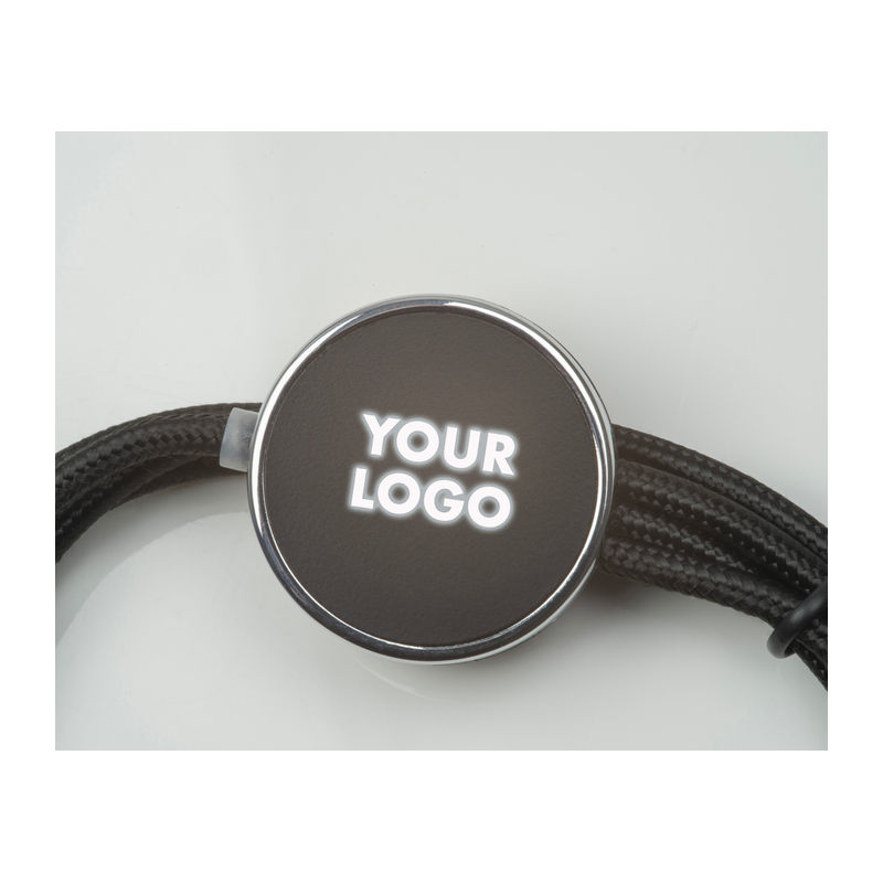 3-in-1 charging cable with a light function in the middle and a length of 120cm. The charging cable has a USB-C, micro-USB and iOS output and a USB type A and C input. We engrave your logo on the round plate, the engraving lights up during the charging process.