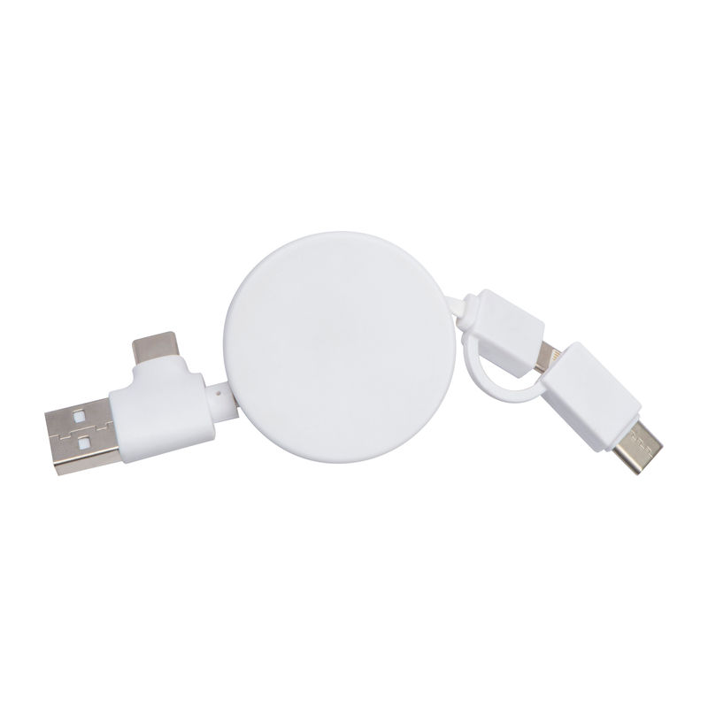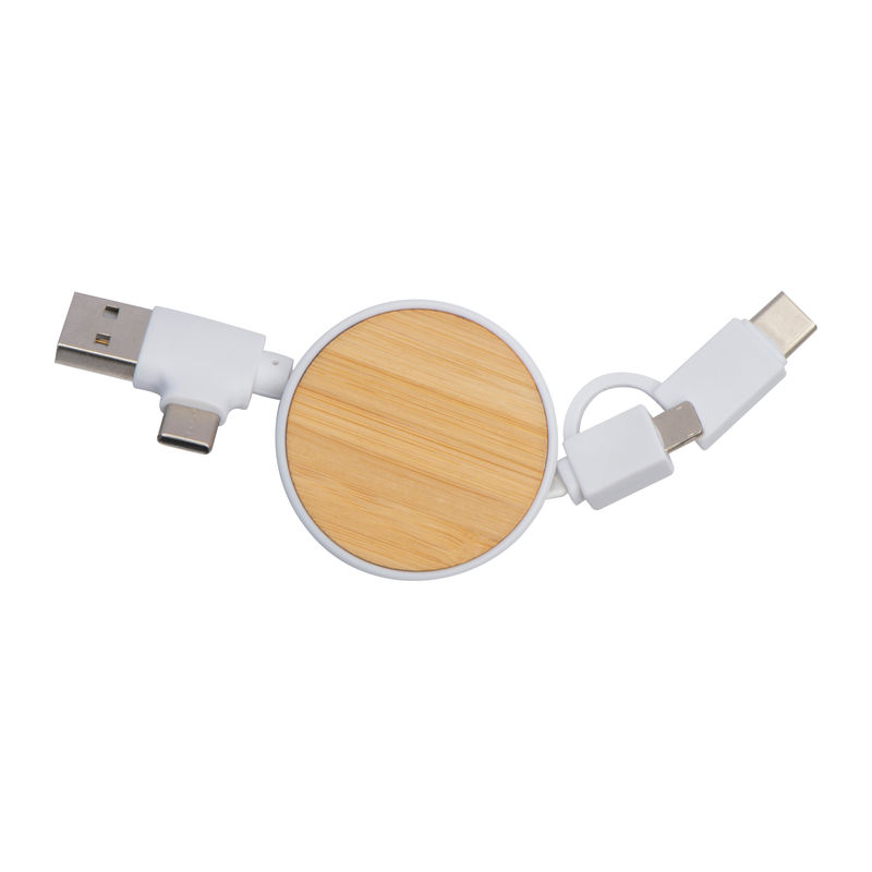 Extendable charging cable featuring a plastic housing with a bamboo plate, equipped with USB, 2 Type-C connectors, and an iOS adapter. Each unit and engraving is unique due to the natural bamboo material.
