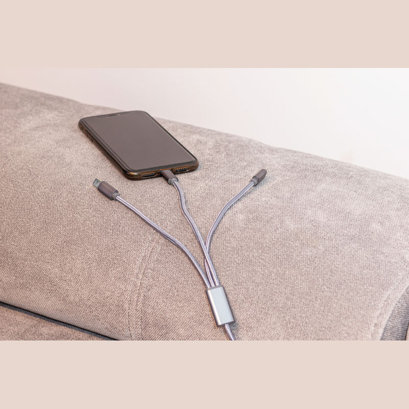 4in1 charging cable made of nylon, with a length of 120cm and four different connections. USB, micro-USB, USB-C and lightning. Your logo will be placed on the middle plastic part.