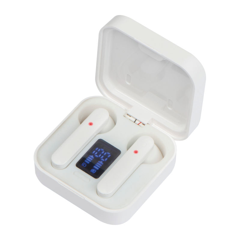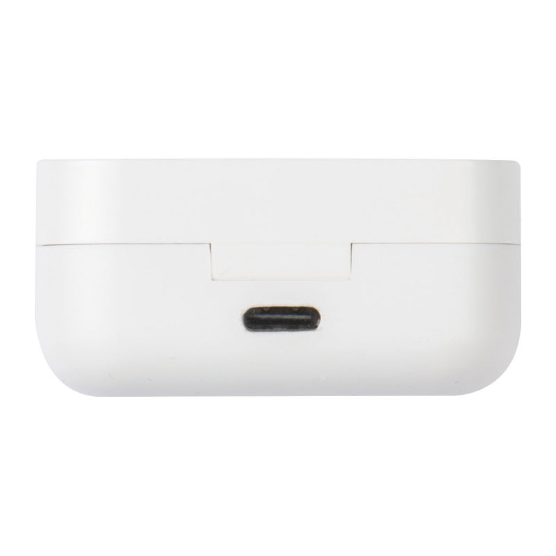 Bluetooth earphones with a 35 mAh battery, solar-powered docking station, battery level indicator, and headset function. Operating time: 2–3 hours. Charging time via cable: approx. 1 hour. Charging time via solar panel: approx. 4 hours. The product includes a Type-C charging cable.