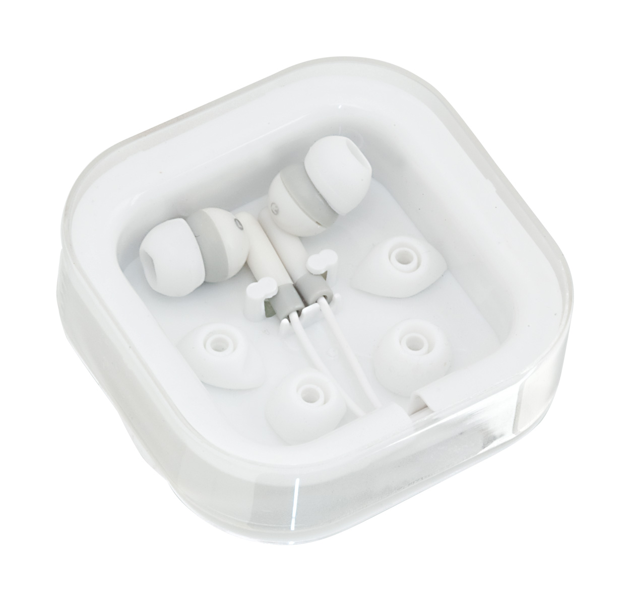 In-ear earphones with 3,5 mm audio jack and 3 pairs of earbuds, in plastic case.