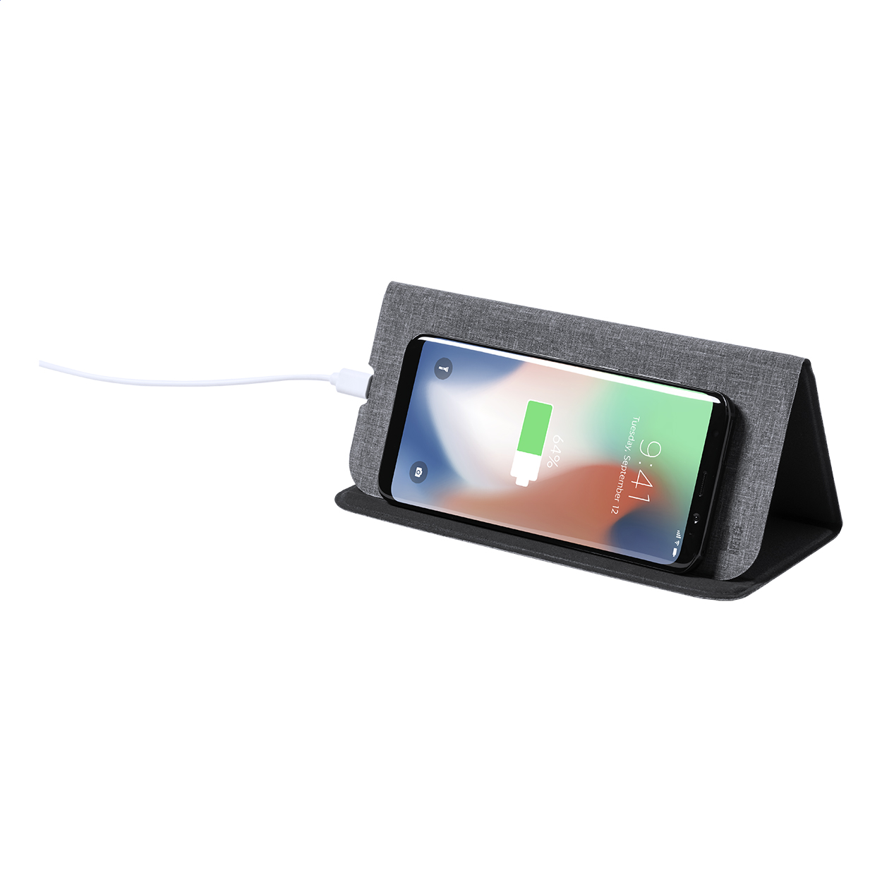 RPET polyester mouse pad with built-in wireless fast charger (10W) and mobile phone holder functions. Including USB charger cable.