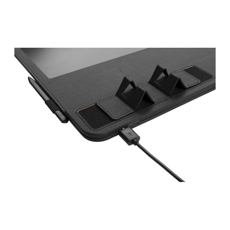An elegant multifunctional Pierre Cardin office mouse pad with a leather-like surface. The mouse pad contains a 10W wireless charger with 5V/2A 9V/1.67A input and 5V/1A 9V/1.1A output, a mobile phone stand, an erasable writting pad with a stylus pen, two pen loops, a glass with backlight for placing your logo and an extra USB input. The mouse pad is rechargable by an USB-C cable which is included in the package. Packed in a gift box, comes with a certificate of authenticity.