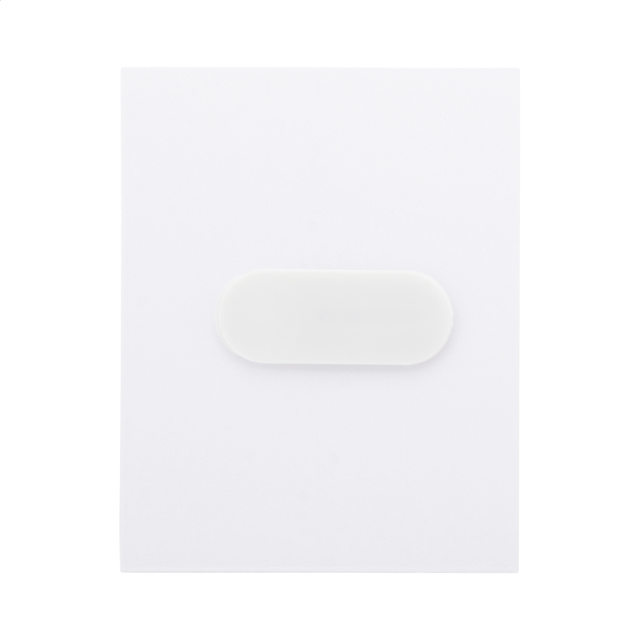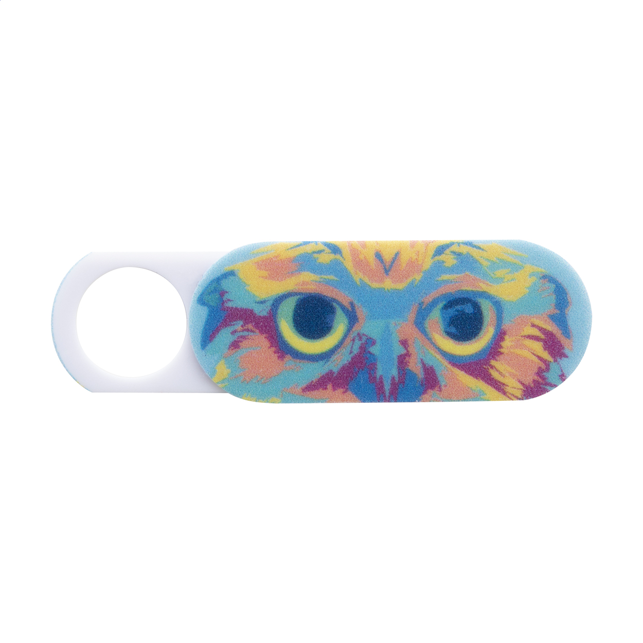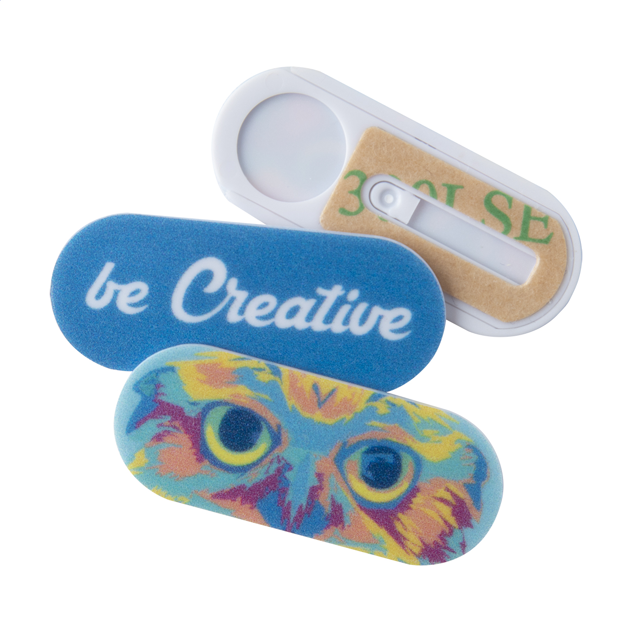 Custom, full colour printed plastic, anti spy webcam blocker with sliding cover and adhesive back. With digital printed paper card. Price includes digital and UV LED printing. MOQ: 100 pcs.