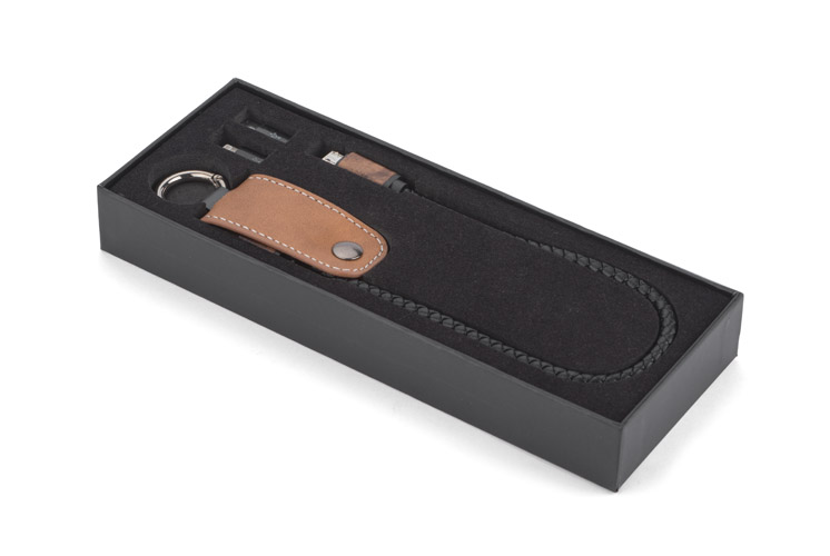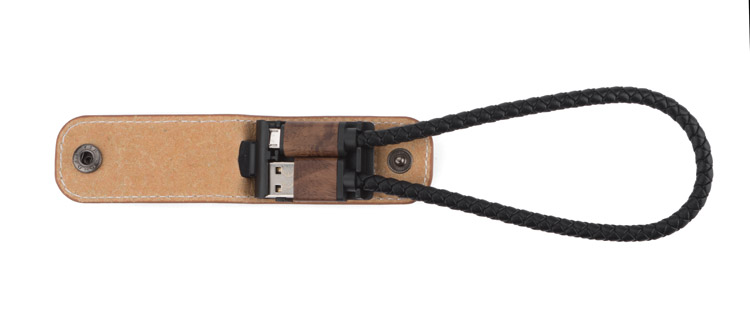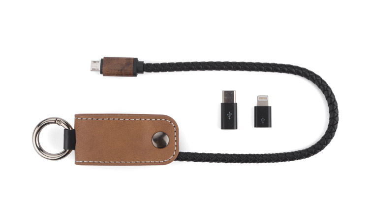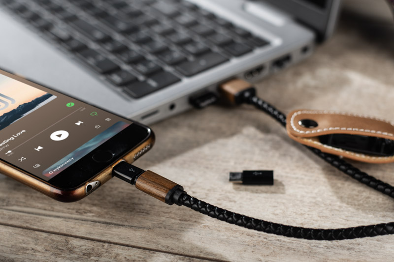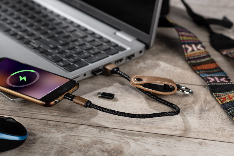 The WEST cable is a premium gadget. Used for charging and data transfer. The cable itself is covered with eco-leather and has wooden ends. Two adapters included: Lightning and C type USB. Thanks to a special handle with the carabiner, the cable can be carried in the form of key fob.