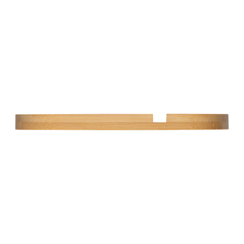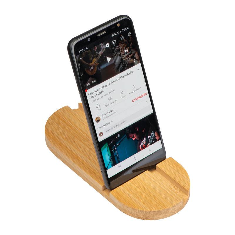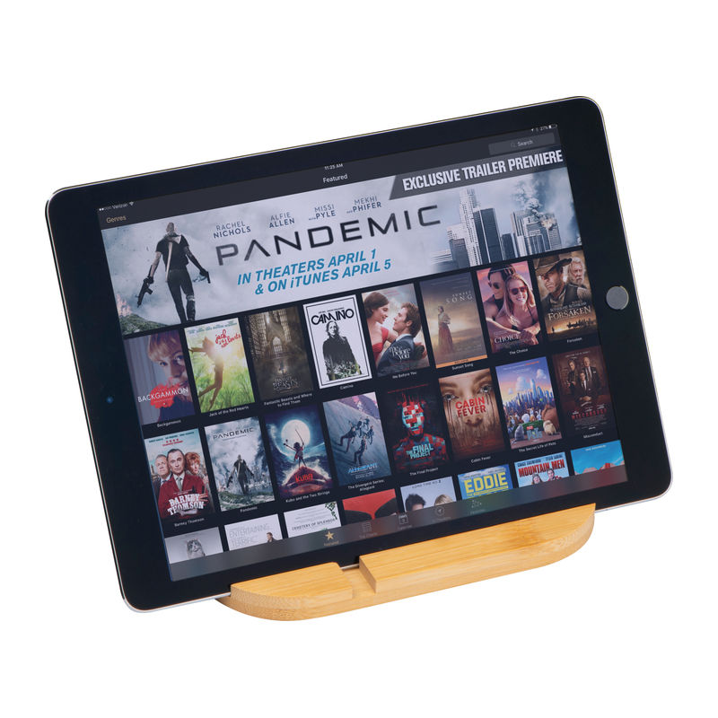 Bamboo tablet and smartphone holder, provides a safe hold for the desk or on the go. Your logo will be engraved on the holder.