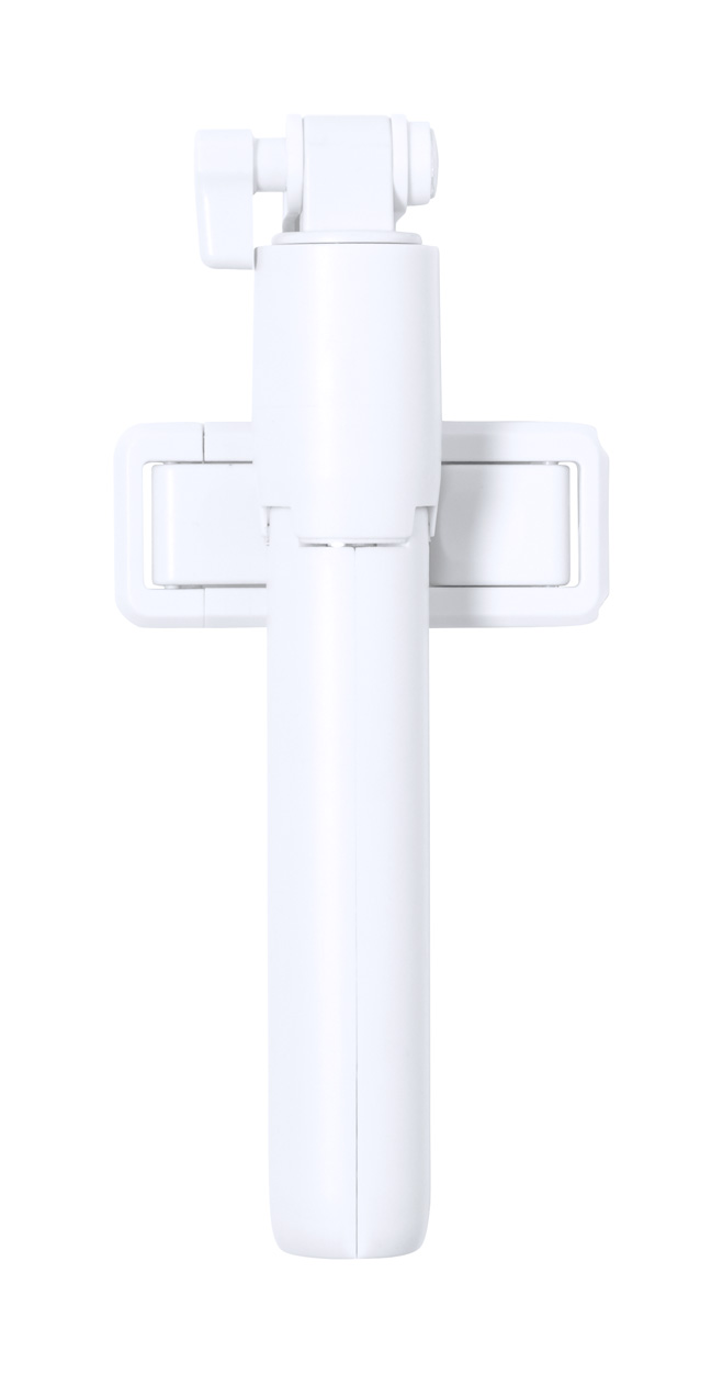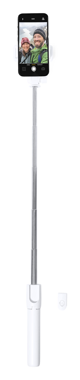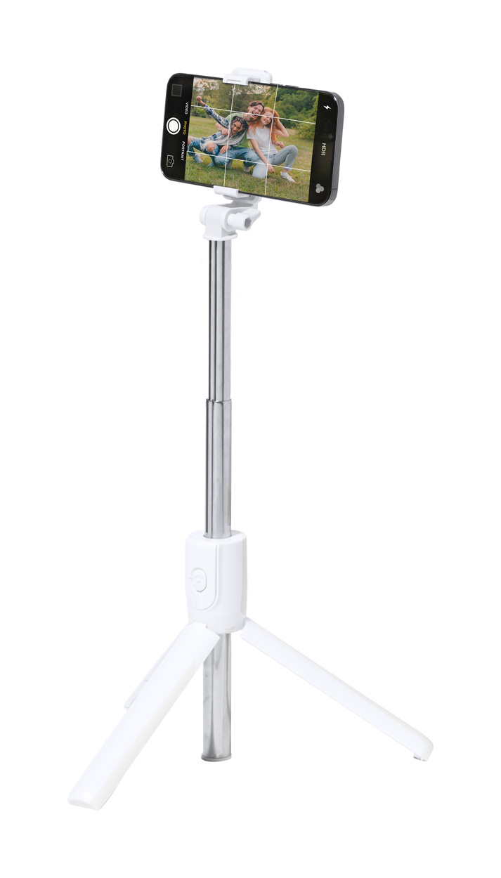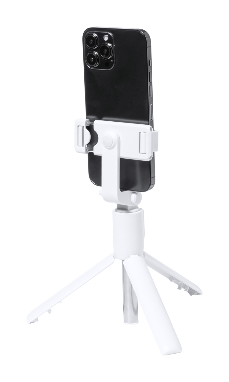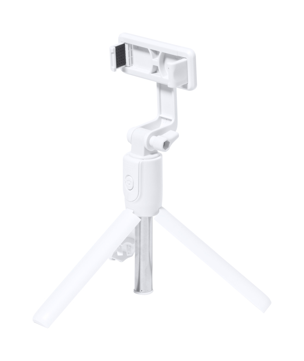 Foldable tripod and selfie stick in ABS plastic and stainless steel with adjustable mobile phone holder. Including wireless shutter remote.