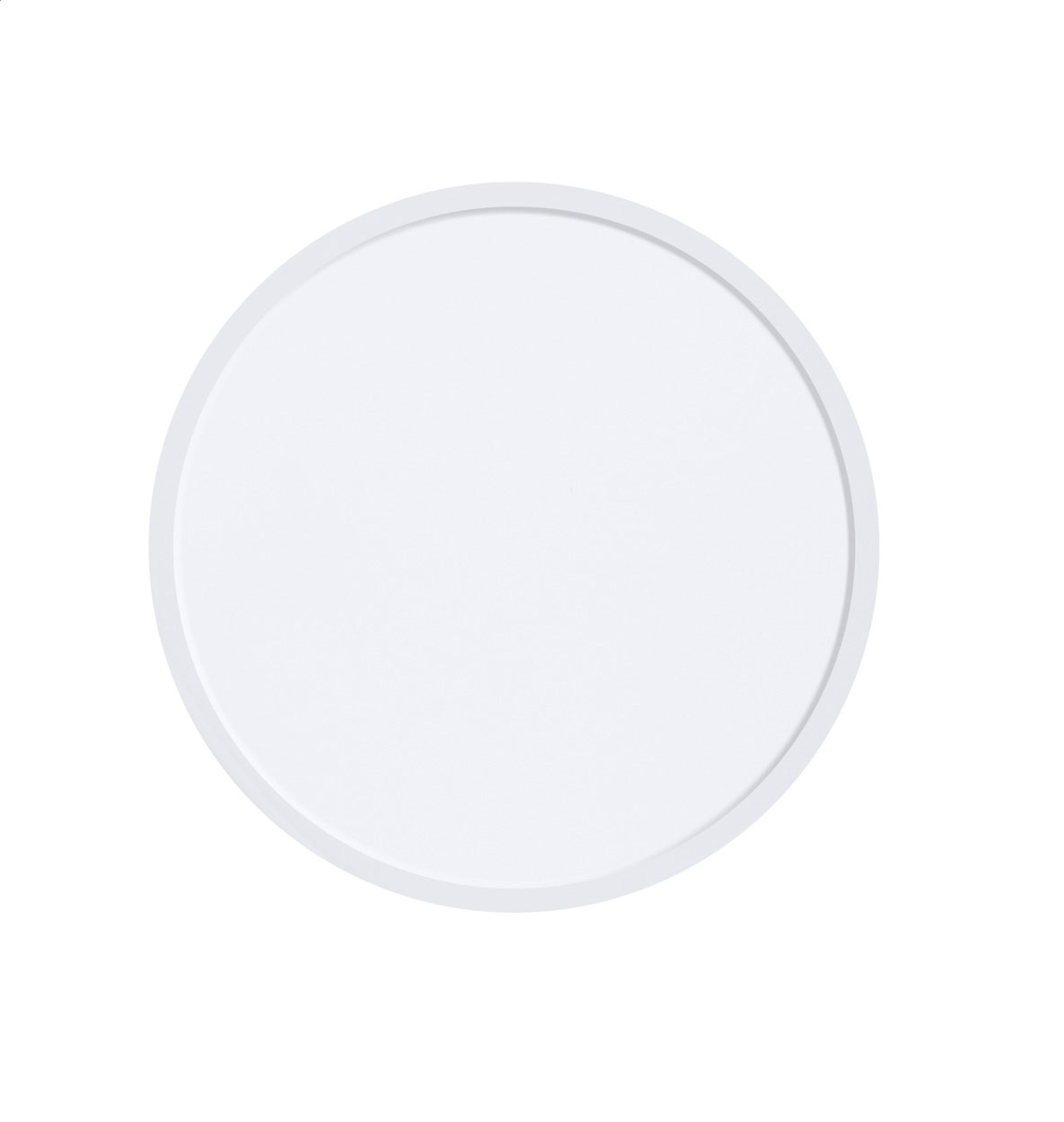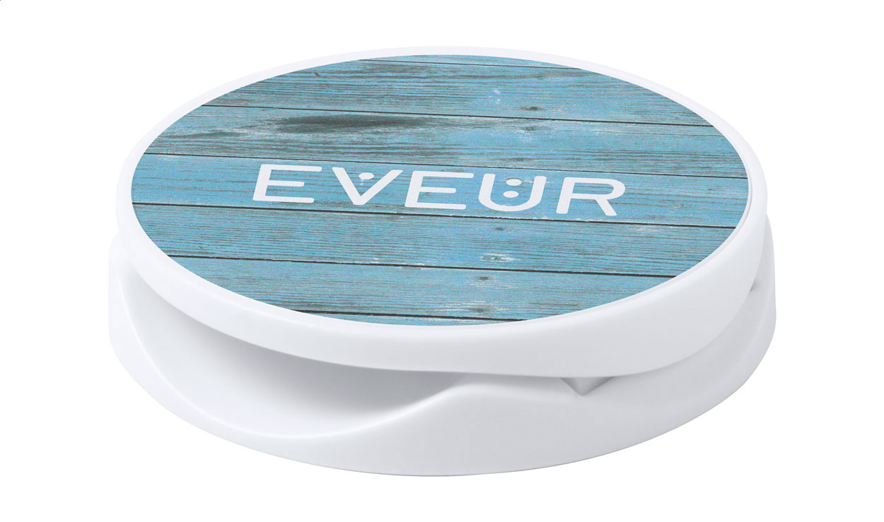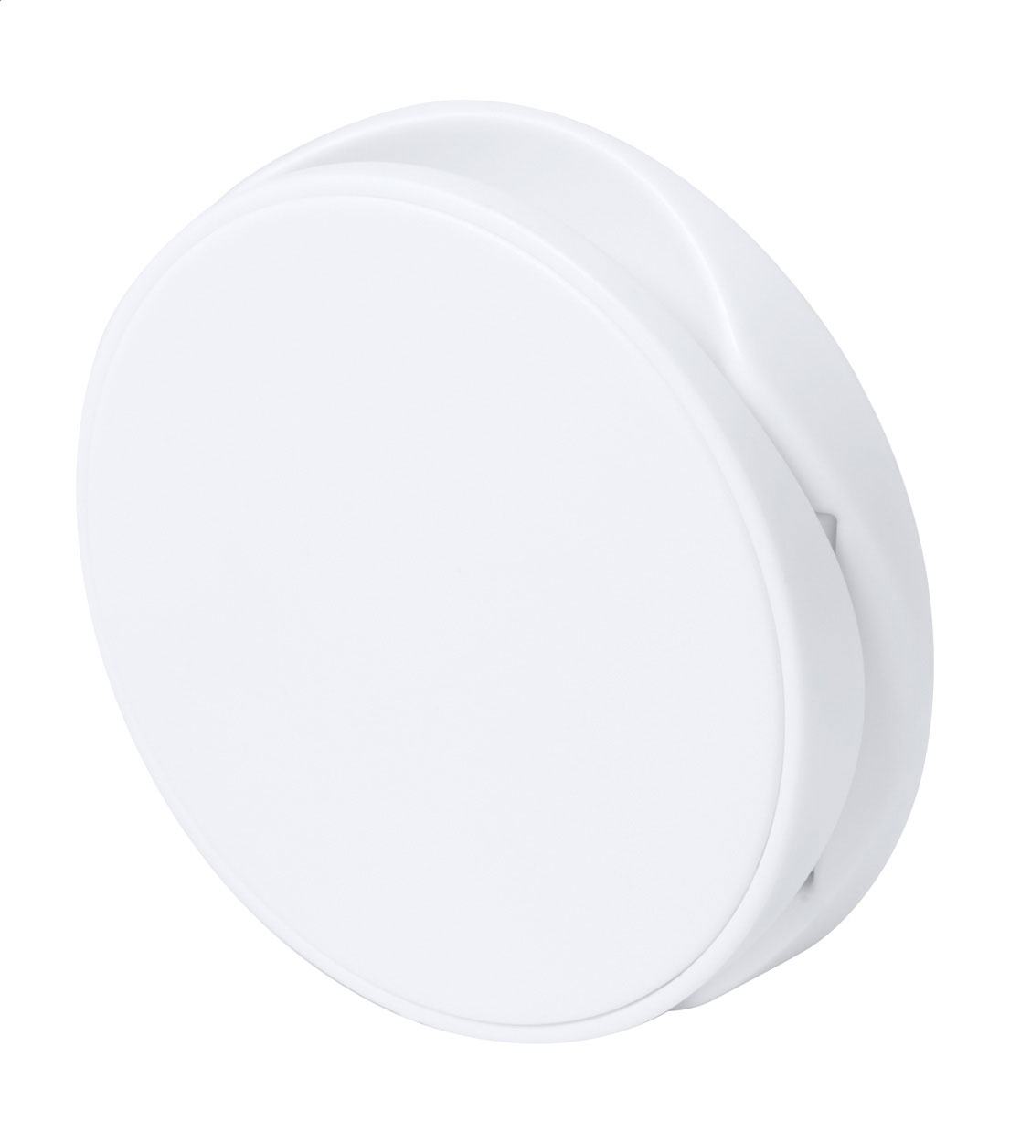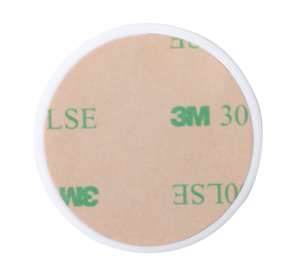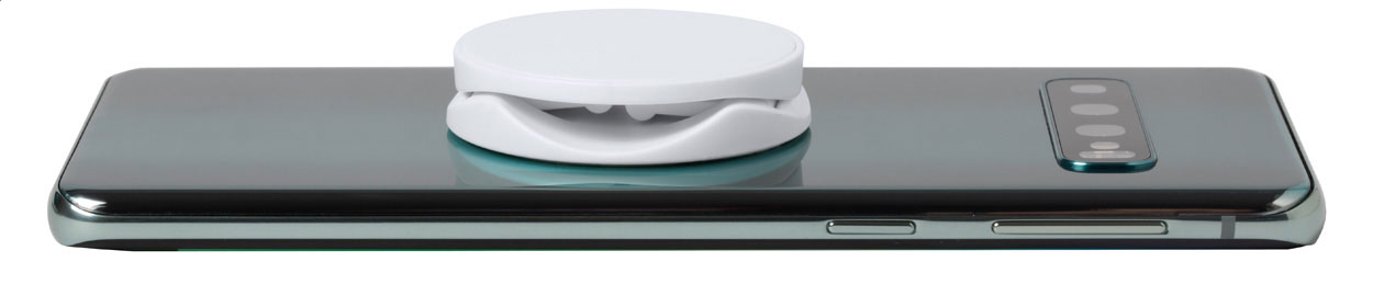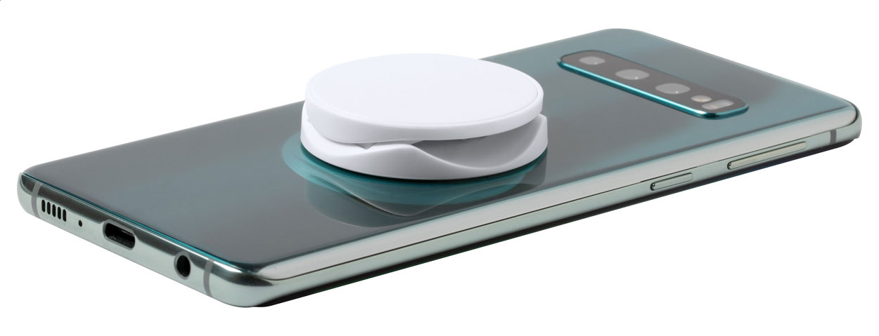 Round shaped, plastic mobile holder with self-adhesive base.