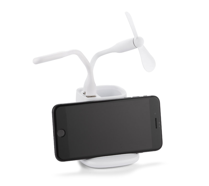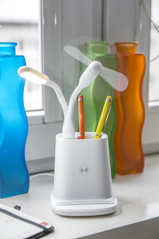The BERGO desk organizer is the perfect gadget for working at a desk. It has a built-in wireless charger that also serves as a phone stand and two USB ports that will power the accessories included in the product: a fan and a lamp. When not using accessories, the USB ports can function as hubs. Specifications: Micro USB input: 5V / 2A, Wireless charger output: 5W, 2 USB outputs: 5V / 2A (max.)