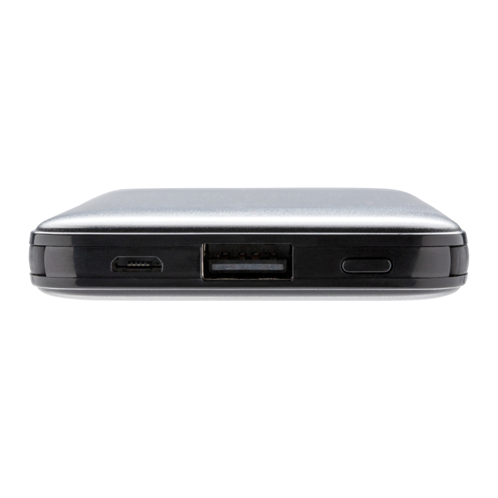 Compact and flat 5.000 mAh powerbank made out of ABS that is easy to take with you wherever you go. With the 3 in 1 integrated TPE cables the powerbank is compatible with all mobile devices in the market and directly ready for use. When fully charged it will provide you with enough energy to re-charge your mobile phone up to two times. The powerbank contains a long lasting grade A 5000 mAh high-density lithium polymer battery. The power indicators will indicate the remaining energy level so you always know when to re-charge. Input: 5V/2A Output 5V/2A.