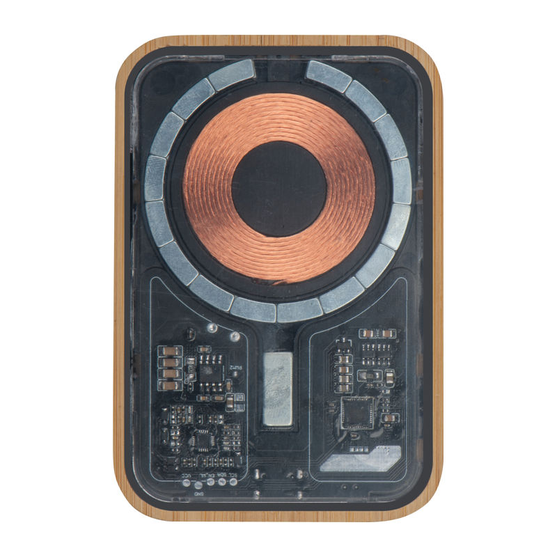 Magsafe® made of bamboo and transparent front with 5,000 mAH power for wireless charging up to 10 watts. Thanks to the integrated magnet, the charger docks onto the Iphone® and ensures fast and wireless charging. Compatible with Iphone® 12 and above, it can be used as a wireless charger for other QI-capable models. We will engrave your logo on the back.