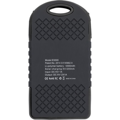 Power bank 4000 mAh, solar charger 5V/200 mA, rubberized finish, green diodes indicating power level, flashlight on the side, 2 USB ports and 1 micro USB port, input DC 5V/1A, output DC 5V/2x1A, USB cable included