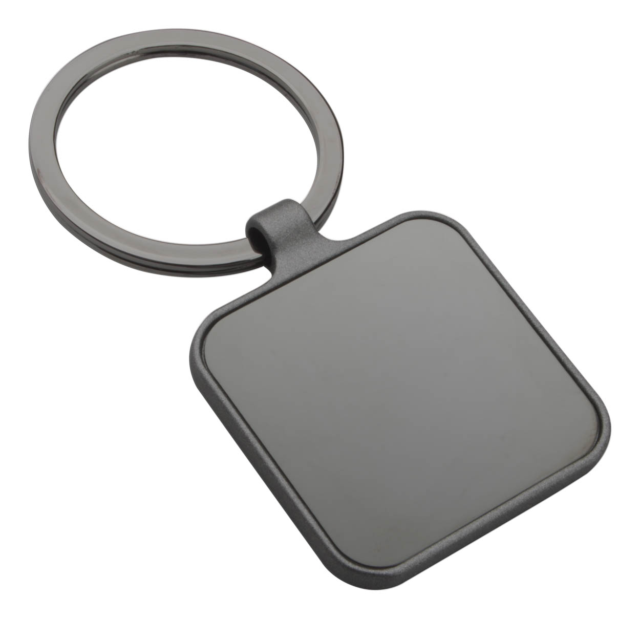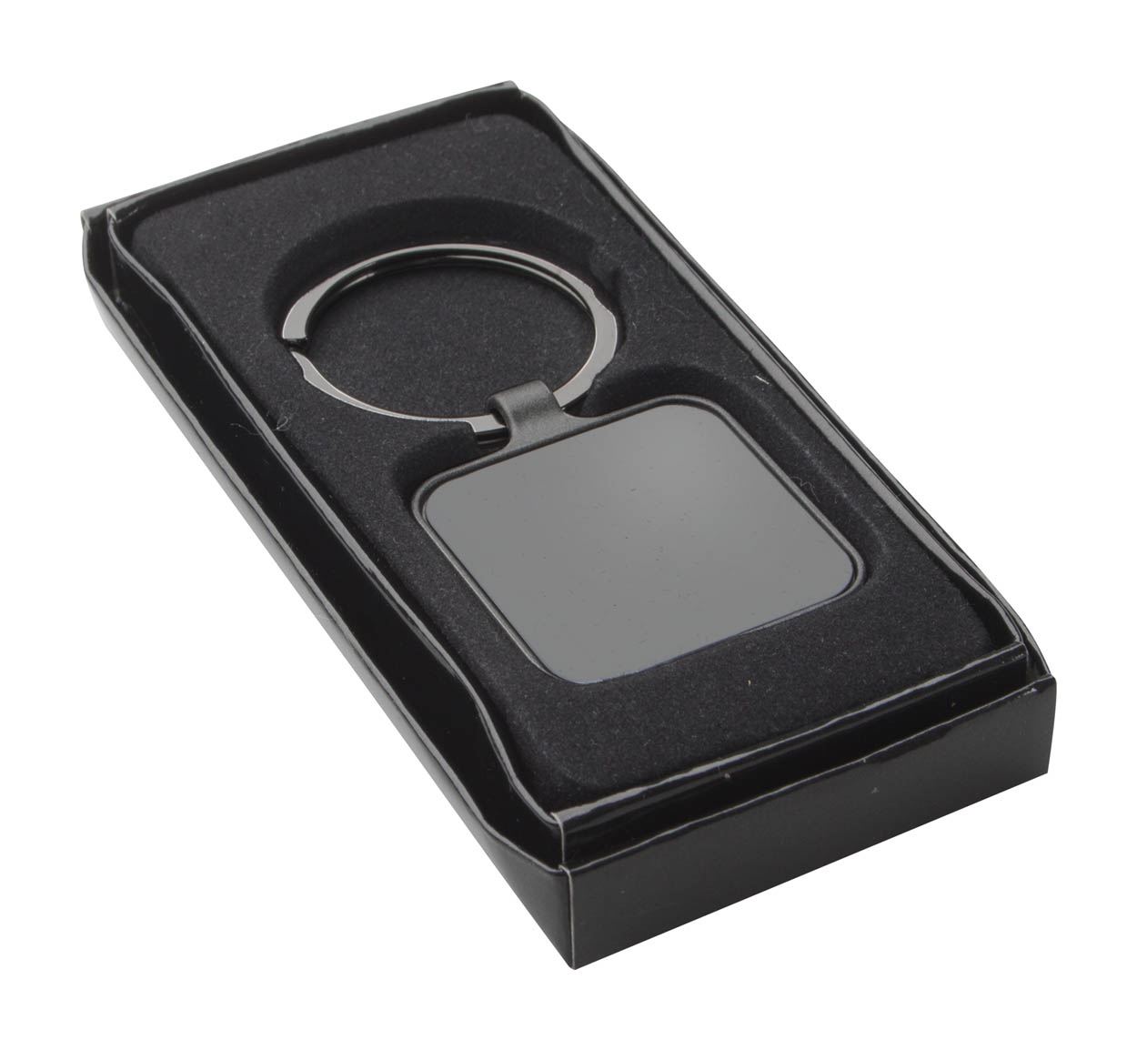 Square shaped metal keyring with gunmetal finish and shiny plates on both sides. In black gift box.