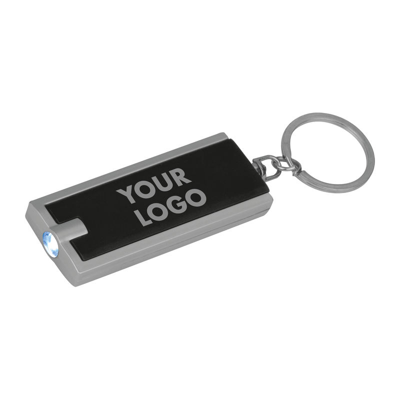 Two-colour key chain with white LED light. We will print your logo on the center.