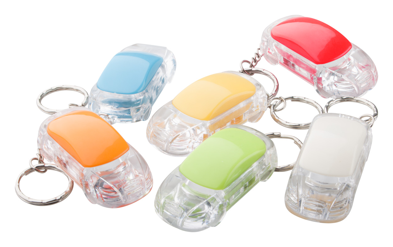 Car shaped plastic keyring with white LED flashlight and metal ring. With button cell battery.