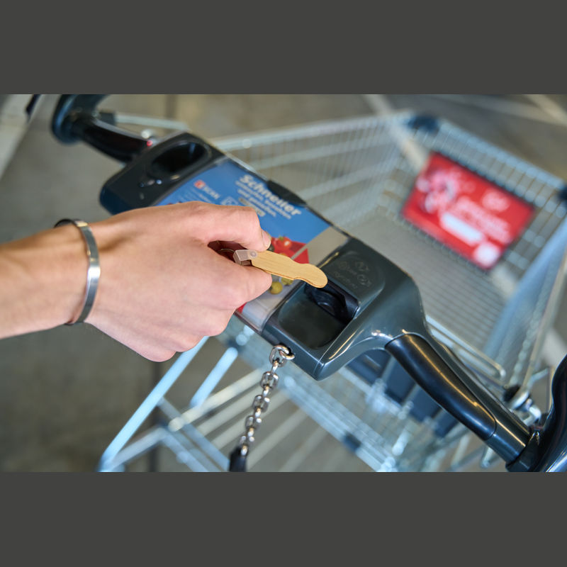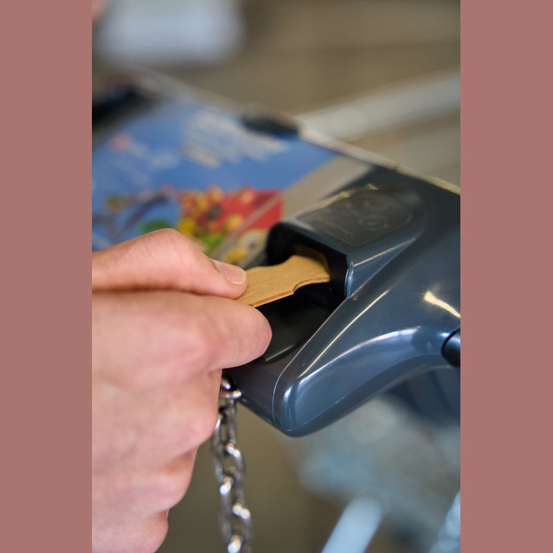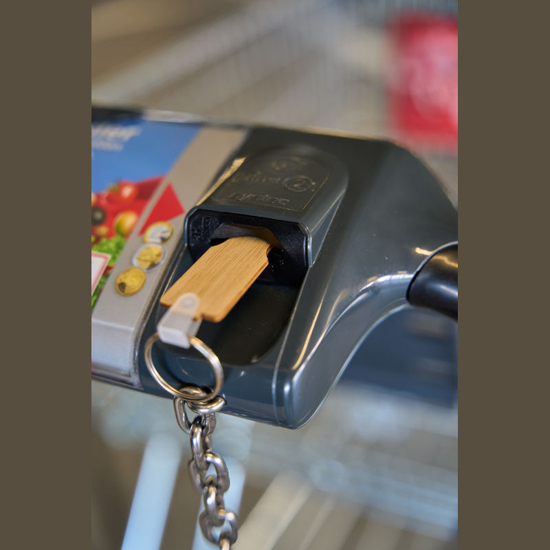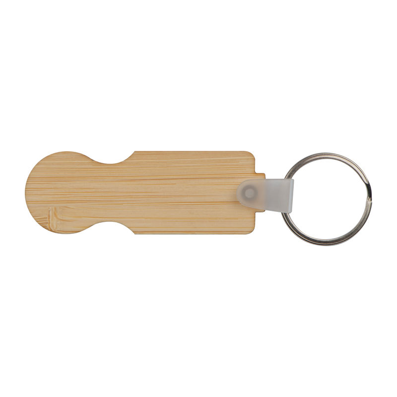 Shopping cart coin key ring crafted from bamboo. Each unit and engraving is unique due to the natural bamboo material.