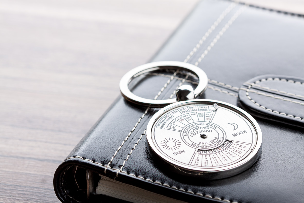 Metal keyring with rotating perpetual calendar until 2060. In black gift box.