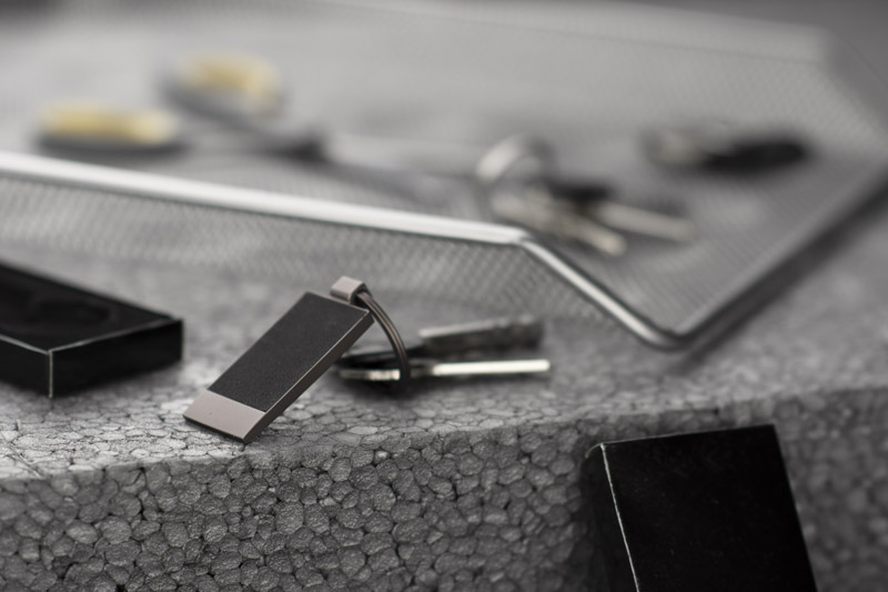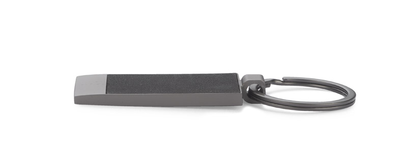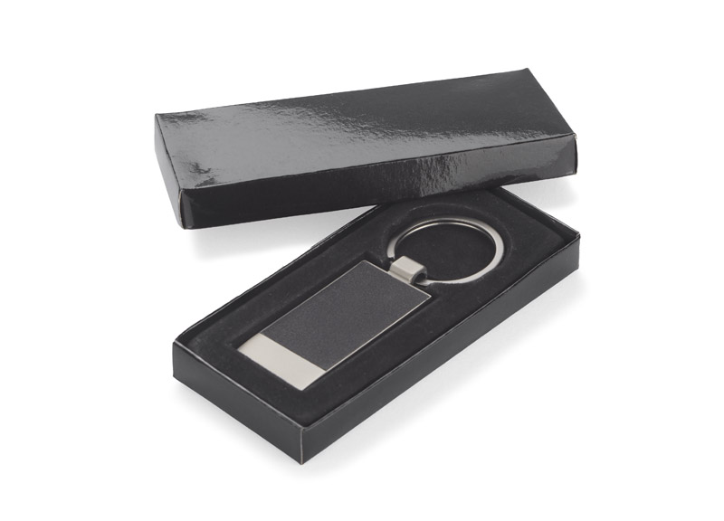 Metal keychain with pleasant-to-touch material. Packed in an cardboard. box