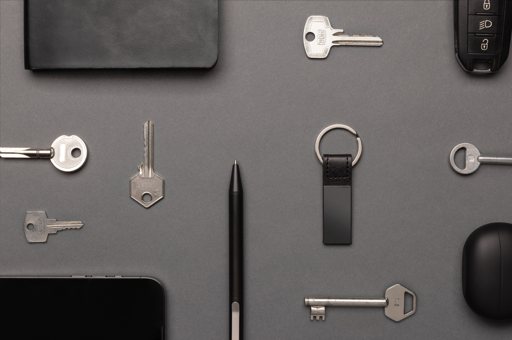 Luxury keychain made with RCS recycled zinc alloy and PU. Total recycled content: 67% based on total item weight. RCS certification ensures a completely certified supply chain of the recycled materials. Packed in paper bag.