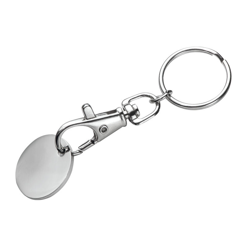 Metal key ring featuring a snap hook and a shopping coin. One side of the coin is colour-coated.